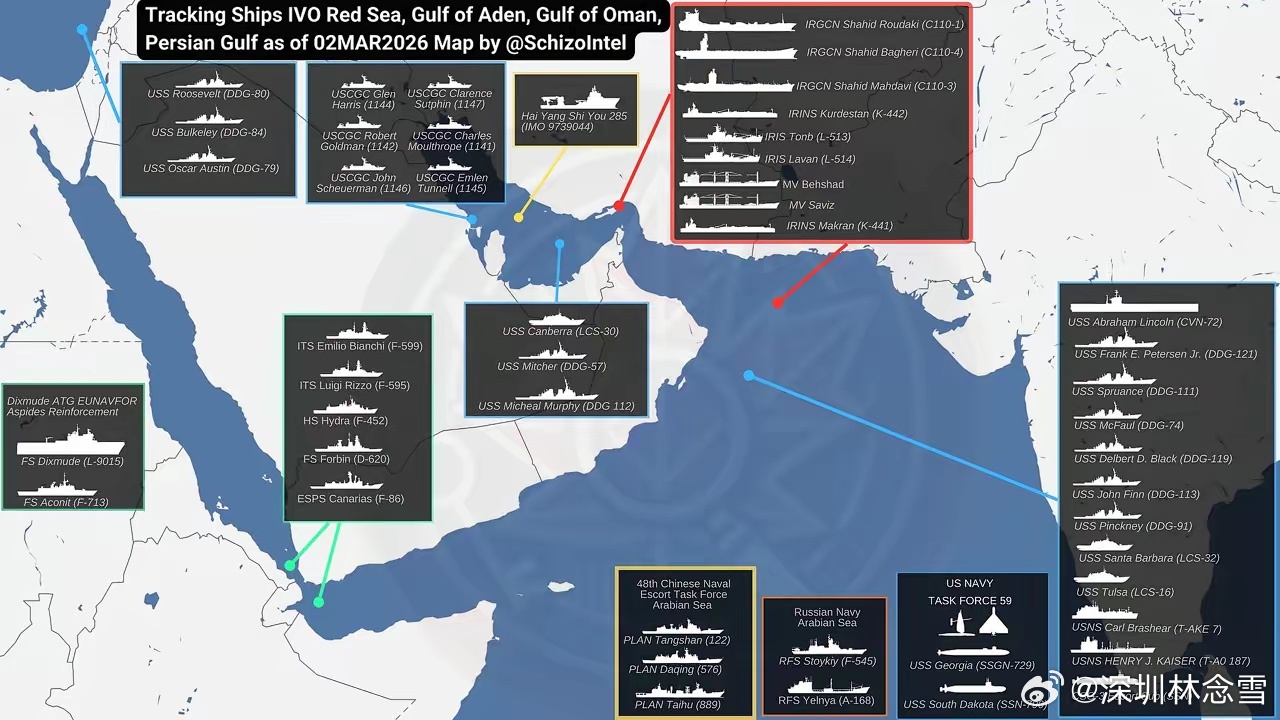 一同前出的还有055万吨大驱拉萨舰(102)、052D开封舰(135)、054A大庆舰(576)、903A综合补给舰太湖舰(889), initially参加中俄伊“安全纽带-2026”联合演习,驻守阿曼湾—霍尔木兹海峡入口,维护航道安全、监控区域态势,演习结束后并未撤离。