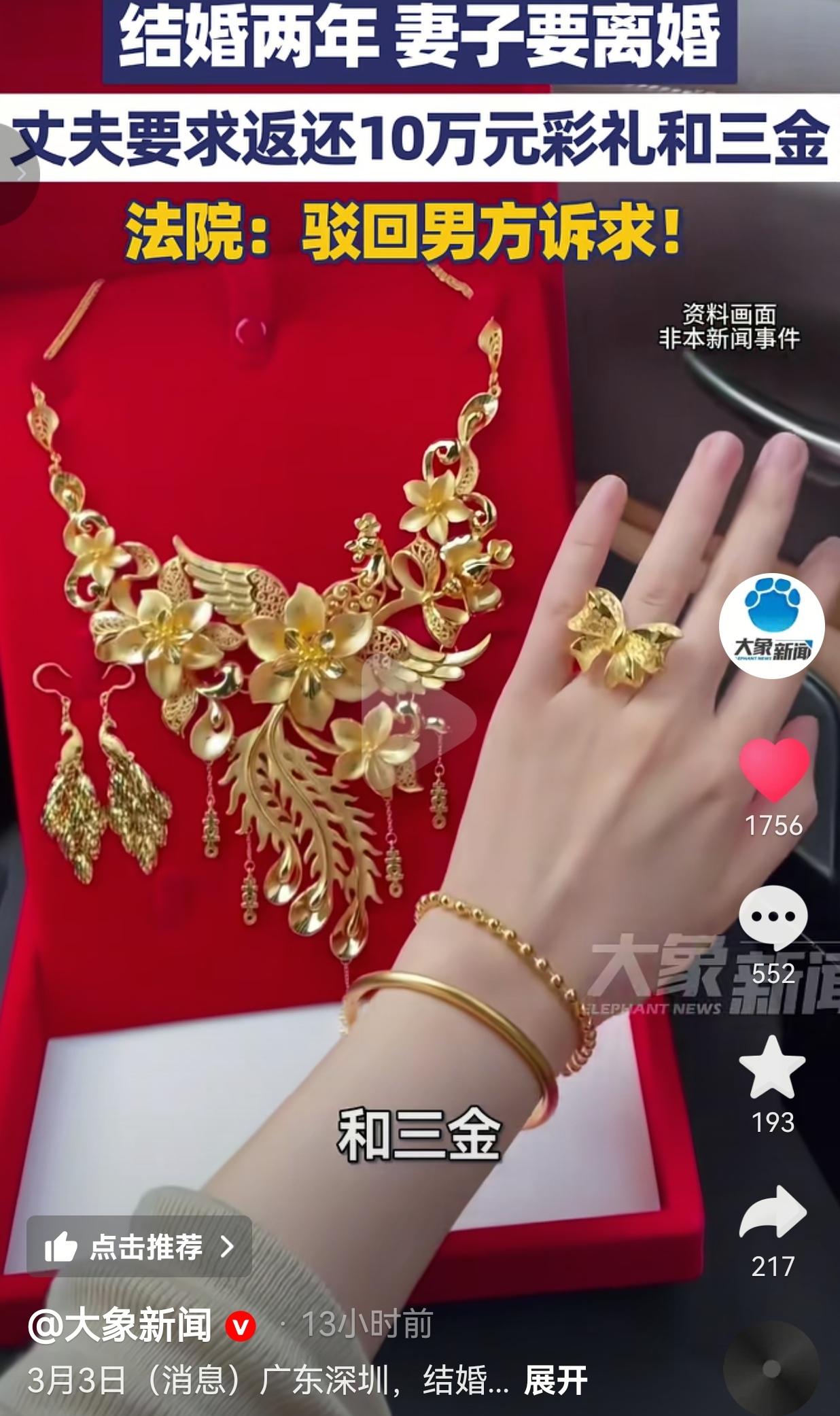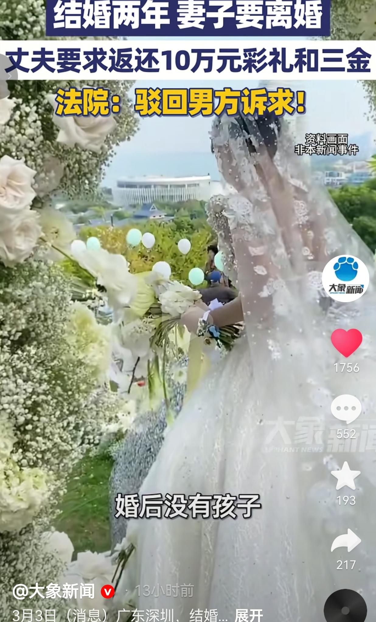 结婚两年要离婚,10万彩礼和三金该不该退?法院判了! 深圳一对夫妻的离婚案,网友真的是吵翻了天! 事情是这样的,小周和小玉2015年相恋,2017年登记结婚,婚后没有孩子。2019年,两人因为感情不合分居,之后妻子小玉起诉离婚。 丈夫小周同意离婚,但提出了一个要求:让妻子返还结婚时给的10万元彩礼和三金。 因为,小周觉得,婚姻只维持了两年,自己花出去的钱,不能就这么打水漂。 可法院的判决,却让他傻了眼:驳回男方要求返还彩礼和三金的诉求。 法院给出的理由很明确:两人已经登记结婚,并且共同生活了近两年。而且,男方给付彩礼后,并没有造成家庭生活困难。 根据法律规定,只有在未办理结婚登记手续、办理结婚登记手续但确未共同生活,或者婚前给付并导致给付人生活困难这三种情况下,才可以要求返还彩礼。 这对夫妻的情况,一条都不沾边。 消息一出,网上立刻分成了两派。 有人站在男方的角度考虑问题,他们是这样认为的:“10万也不是小数目,结婚两年就离婚,凭什么不退?” 也有的网友说:“这不是骗婚吗?钱也太好赚了。” 也有人站在女方的角度考虑问题,他们是这样认为的:“婚姻又不是买卖,共同生活了两年,女方的青春和付出就不算成本了?” “三金是赠与,彩礼是为了结婚,婚都结了,凭什么要退?” 要我说,彩礼这个东西,本来是传统习俗里,男方对女方家庭的一种诚意表达,可现在却成了很多婚姻破裂时,双方撕破脸的导火索。 我们总说,谈钱伤感情,可婚姻里,钱的问题又偏偏绕不开。 小周的心情我能理解,10万对普通家庭来说,确实是一笔不小的开支,婚姻没了,钱也没了,换谁都会心疼。 可反过来想,小玉在这段婚姻里,也付出了两年的时间和感情,她的青春和精力,又该怎么算呢? 婚姻不是一场交易,不能用“亏不亏”来衡量。 当初给彩礼的时候,是心甘情愿的,是奔着一辈子去的。可当感情走到尽头,再翻旧账,只会让曾经的美好,变得面目全非。 这件事也给我们所有人提了个醒:彩礼可以有,但不能成为婚姻的枷锁。结婚前,把钱的问题说清楚,把底线划明白,比什么都重要。 而当婚姻真的走到尽头的时候,体面的放手,比纠缠那点钱,更能守住最后的尊严。 对此,你怎么看?欢迎大家评论区讨论留言。 (信息来源:大象新闻)
