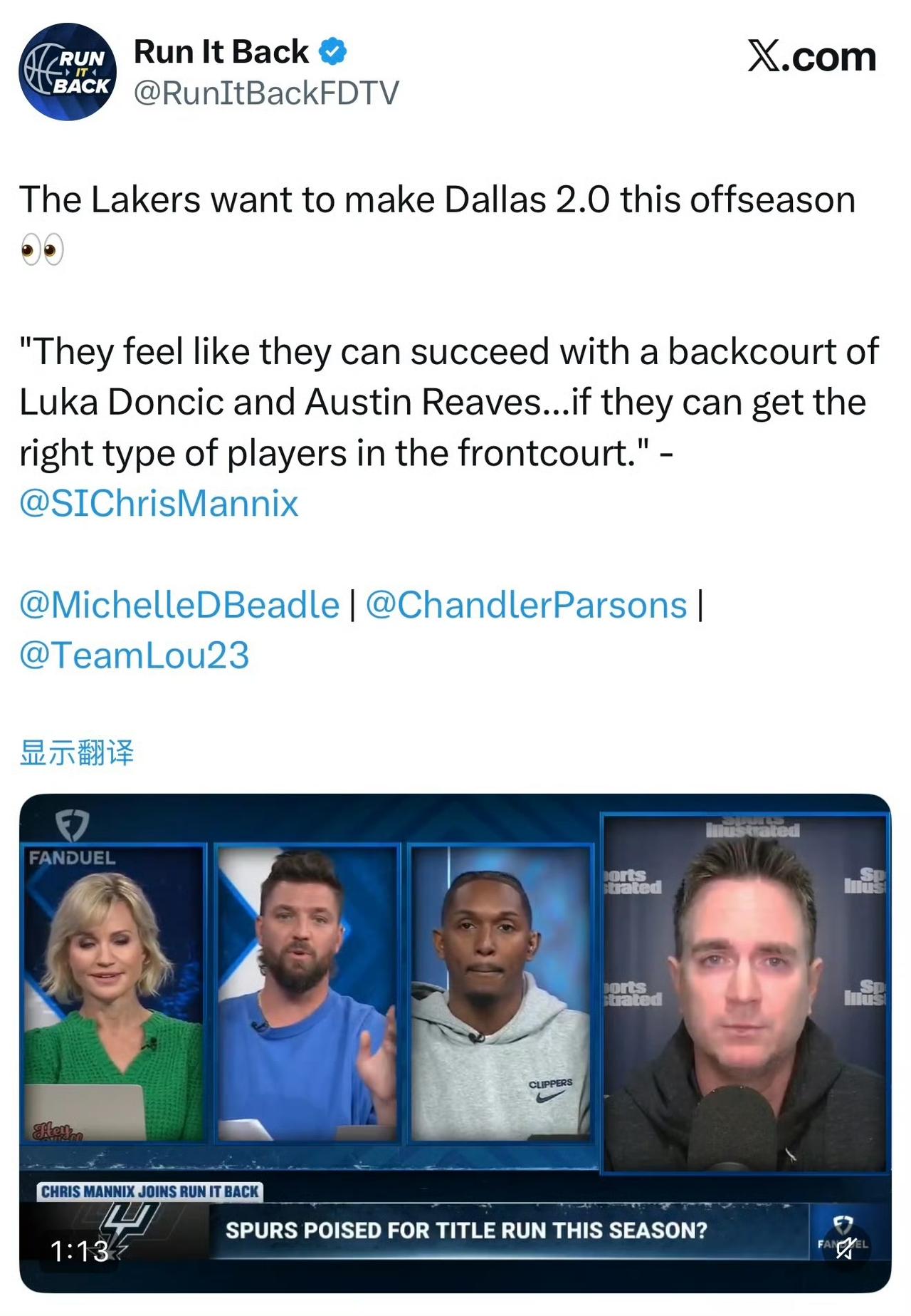 据知名记者ChrisMannix透露,湖人队认为东契奇和里夫斯的后场组合能够取