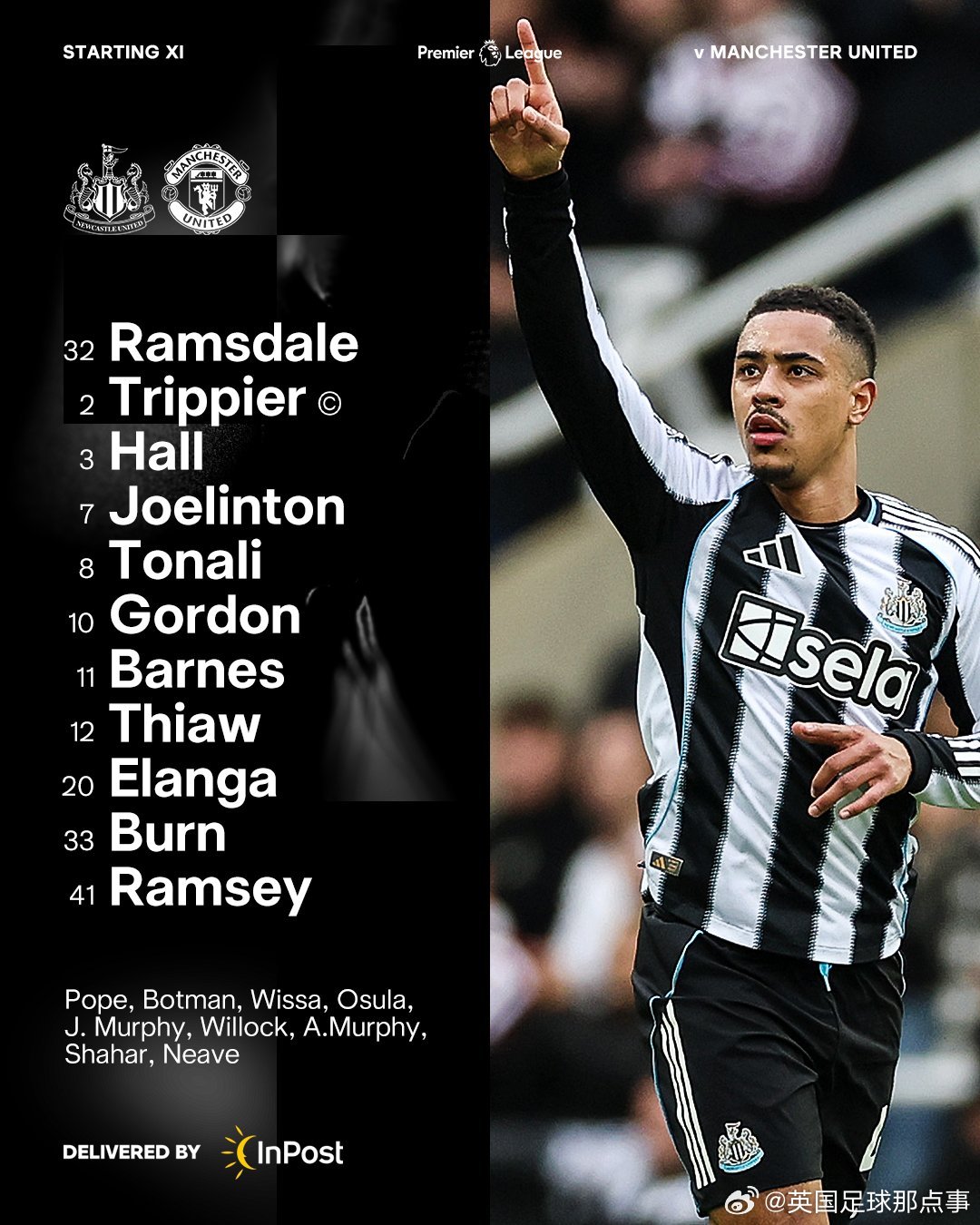 纽卡首发:32-拉姆斯代尔、2-特里皮尔、3-刘易斯·霍尔、12-佳夫、33-丹-伯恩、7-乔林顿、8-托纳利、41-雅各布·拉姆塞、10-戈登、11-巴恩斯、20-伊兰加
