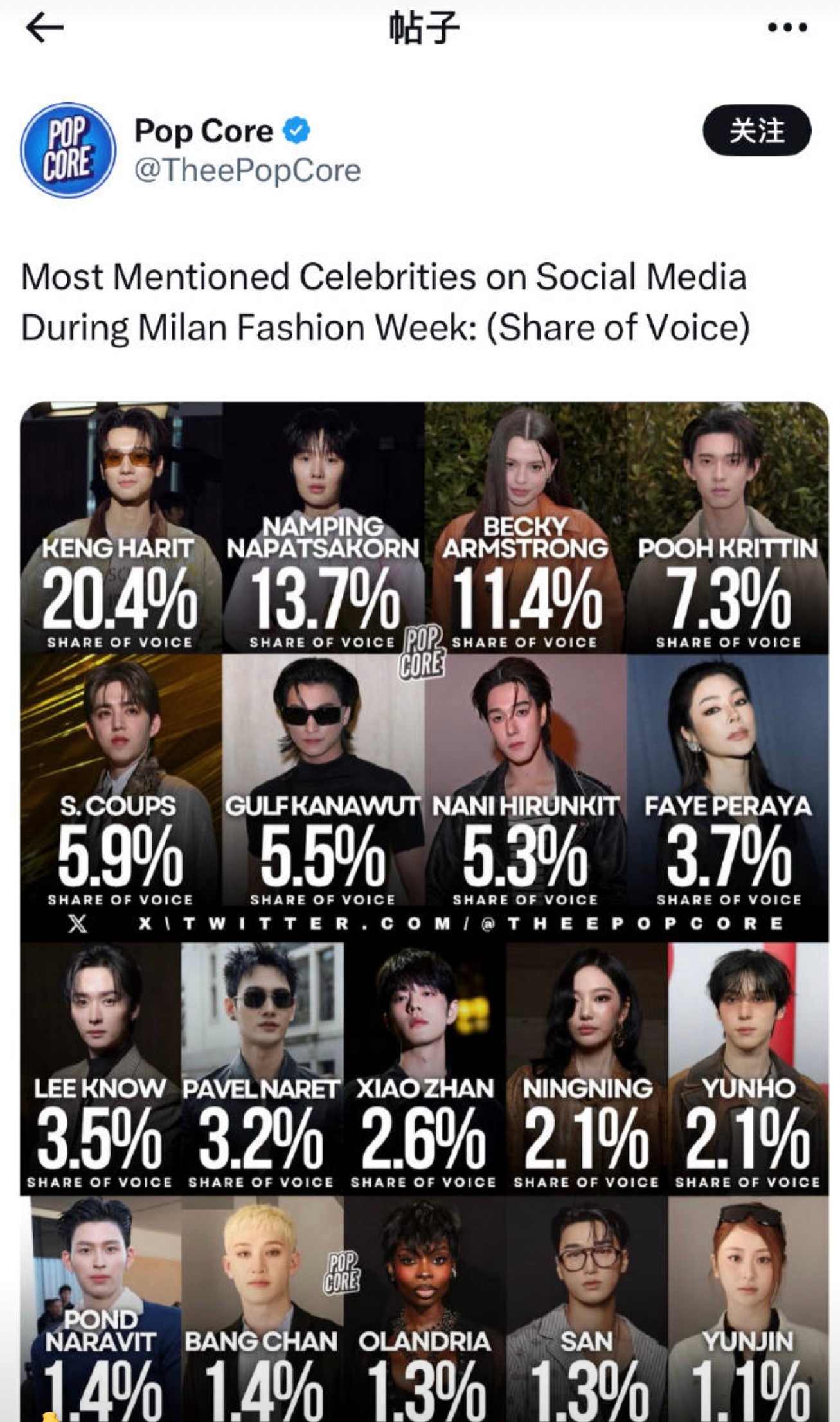 米兰时装周米兰时装周期间社交媒体上被提及最多的艺人排行榜,肖战居然仅占2.6%,粉丝不是都吹他各种c位巨星待遇吗,和高管各种合照,怎么国外没人认识他。