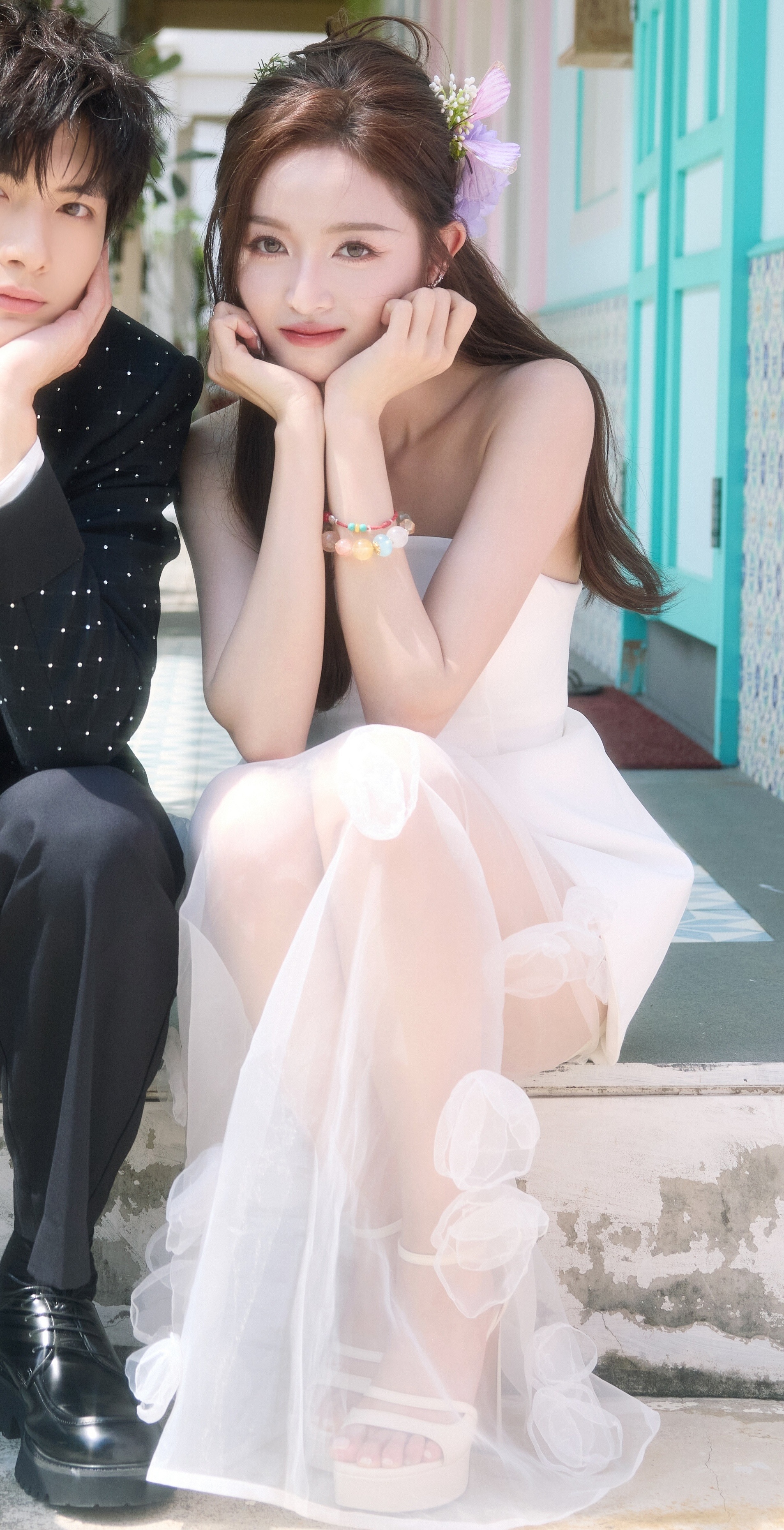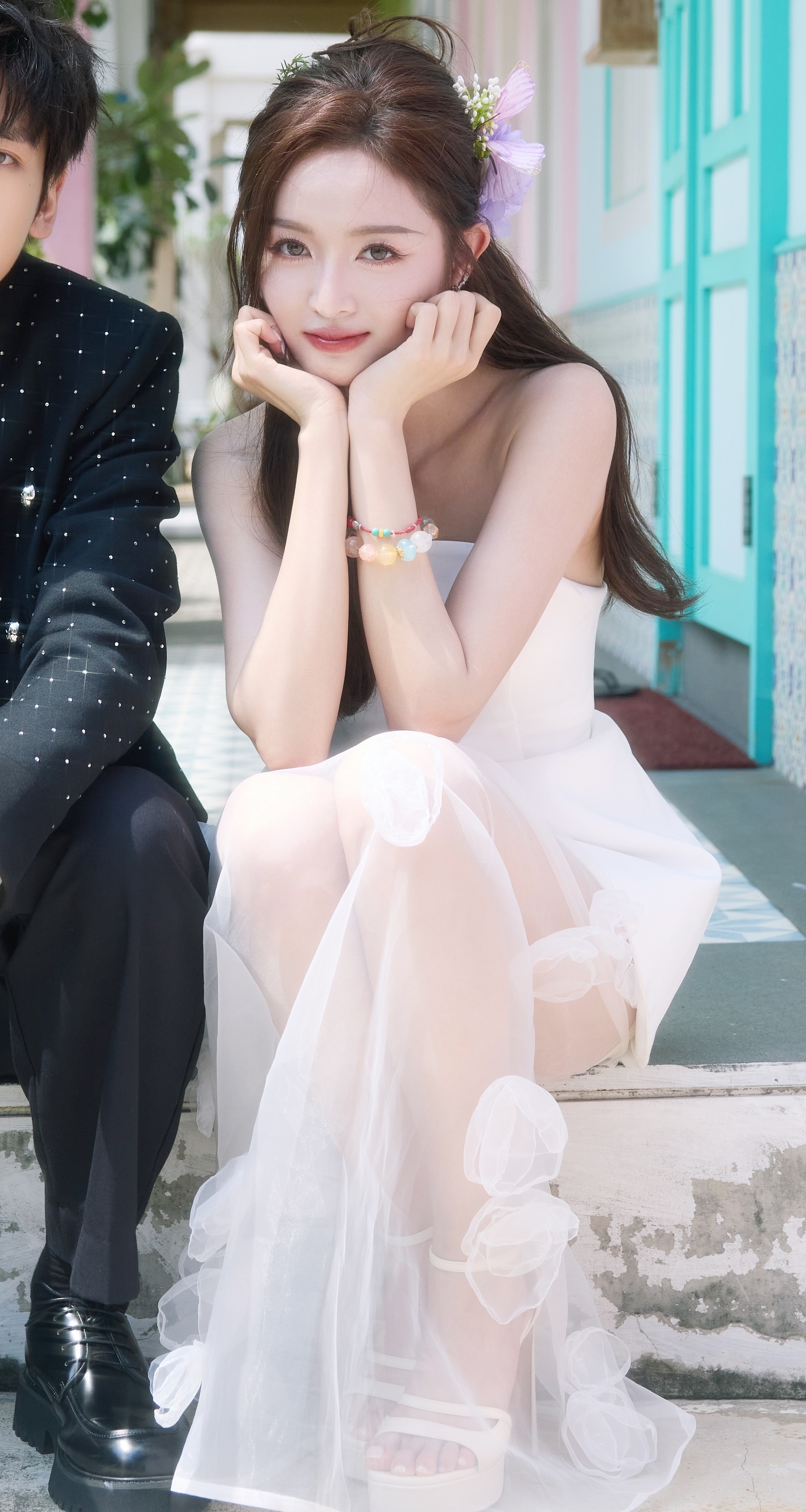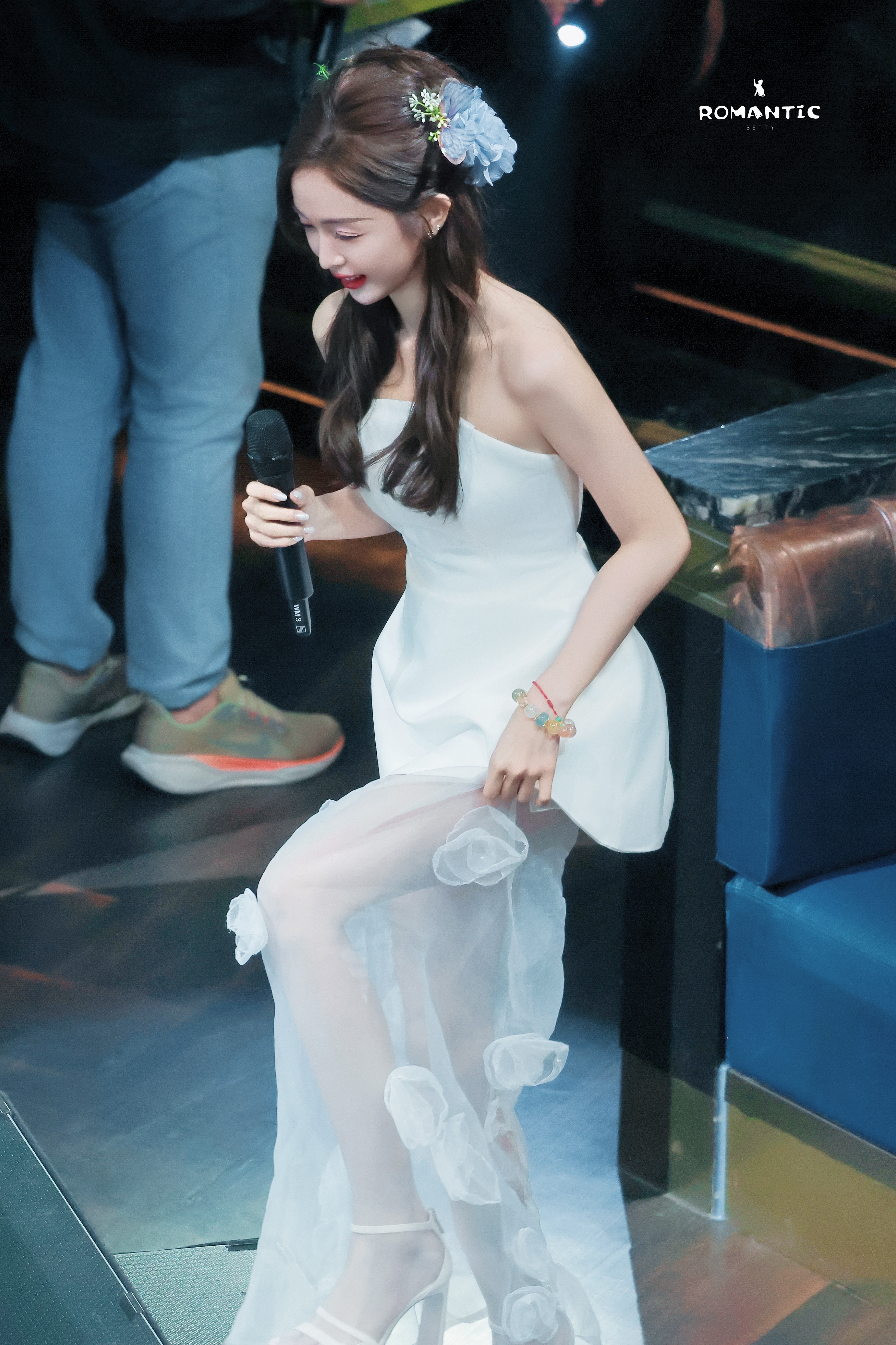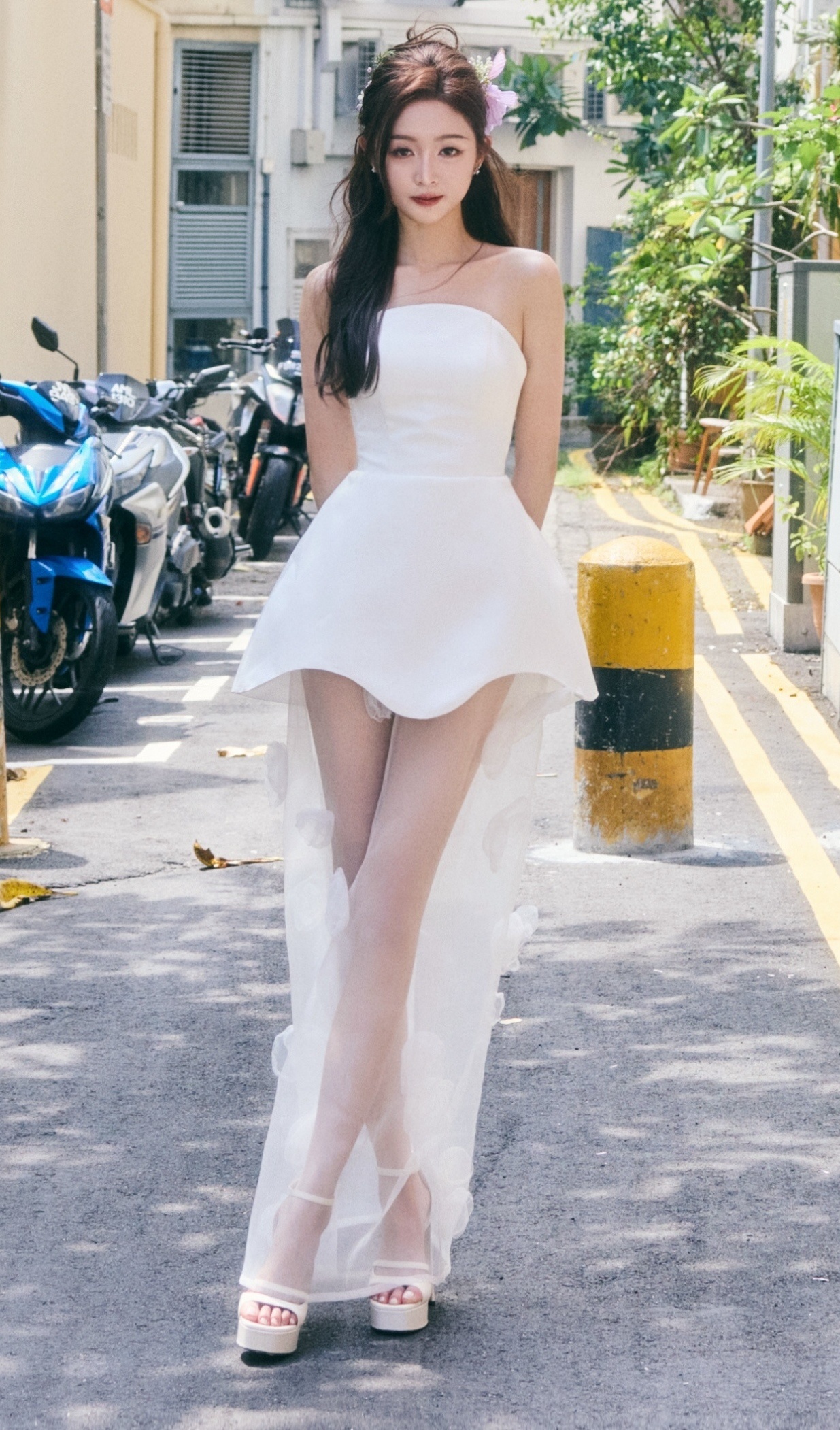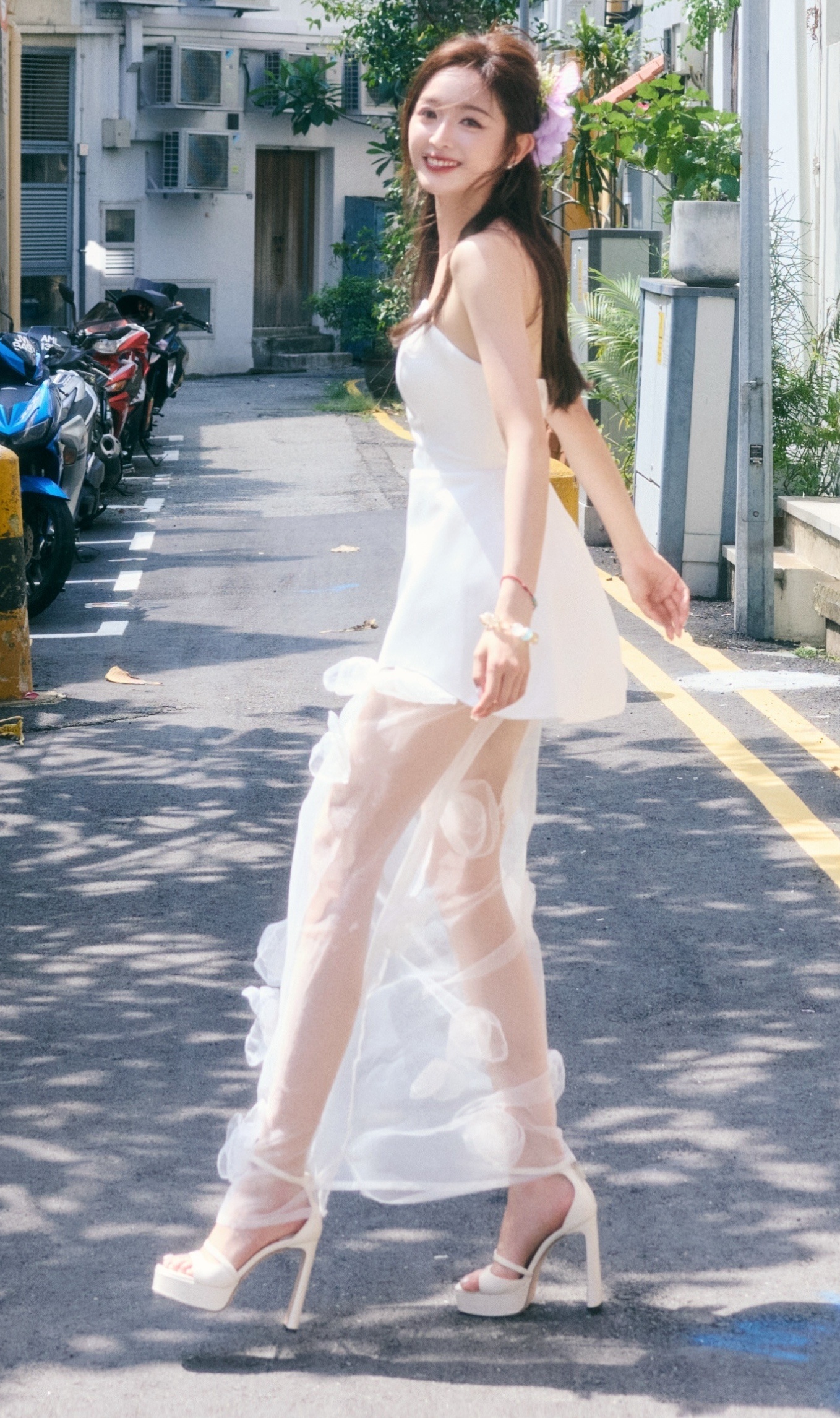 吴宣仪自己走机场宣仪白色纱裙大长腿配白色一字带高跟