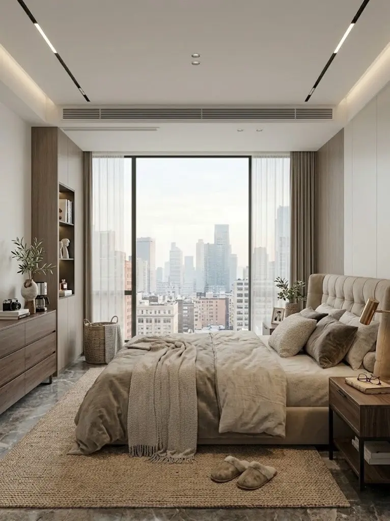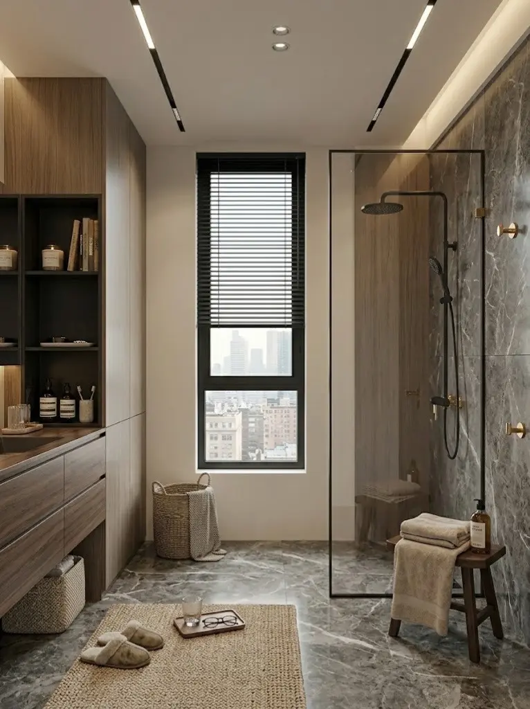 主卧与独立书房延续了无主灯设计与低饱和度的大地色系。大面积落地窗将自然光影引入室内,书桌上翻开的笔记、床畔柔软舒适的居家拖鞋🩴,无一不在诉说着屋主随性惬意的生活态度。卫浴空间则采用深灰色石材搭配极窄边框玻璃,干湿分离的利落设计兼顾了日常实用性与高定酒店般的沐浴体验。🛁