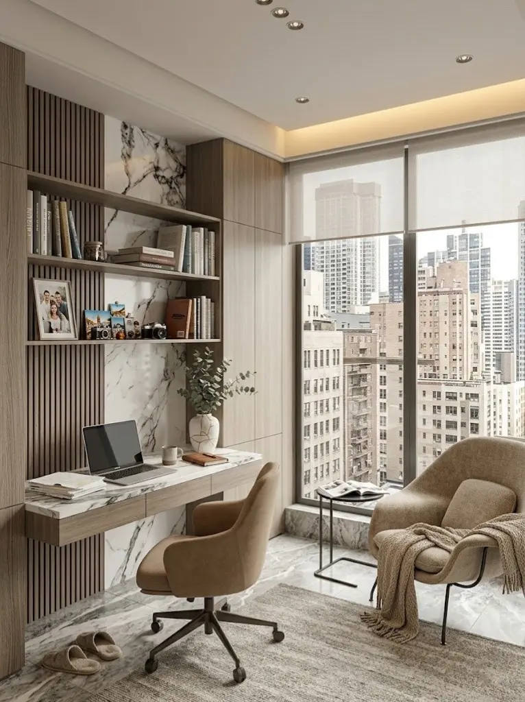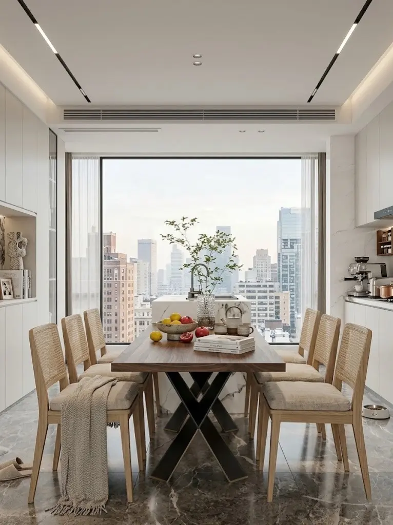 通透的开放式客餐厅将高层视野优势最大化🌆。空间中摒弃了繁冗的装饰,以温润的木质立面与天然大理石穿插交错,冷暖材质的碰撞勾勒出高级且专业的几何秩序感。从餐岛台上飘香的手冲咖啡☕,到客厅布艺沙发上随意搭着的柔软披毯,都在不经意间打破了极简的高冷,为空间注入了真实而温热的生活化气息。📖