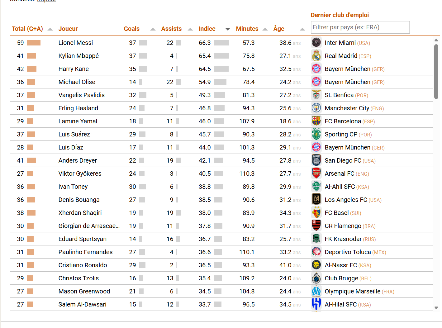 CIES足球天文台发布最新统计报告,统计了过去一年全球67个联赛中参与进球最多的球员。从纯数据角度看,在不区分联赛水平的情况下,梅西以59次参与进球(37球+22次助攻)领跑榜单,较其他任何球员多出17次。