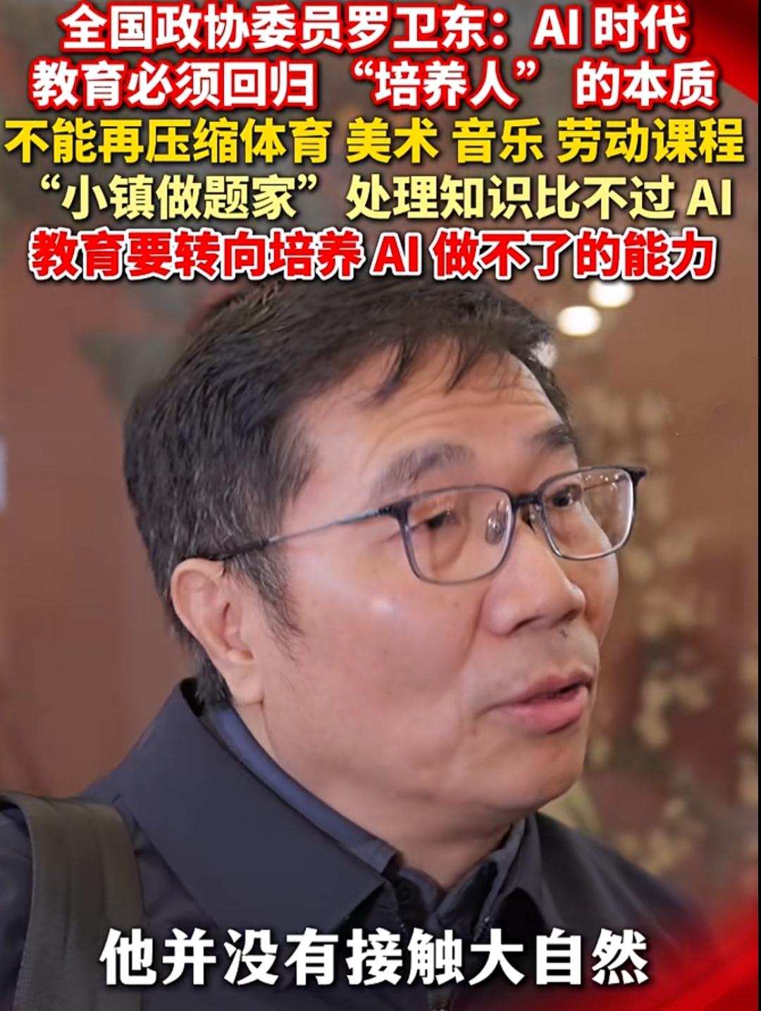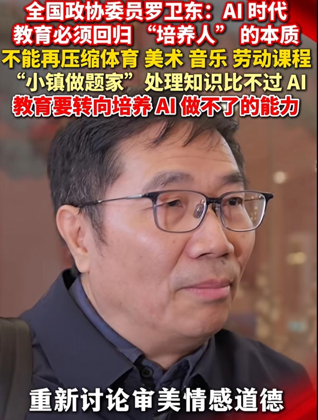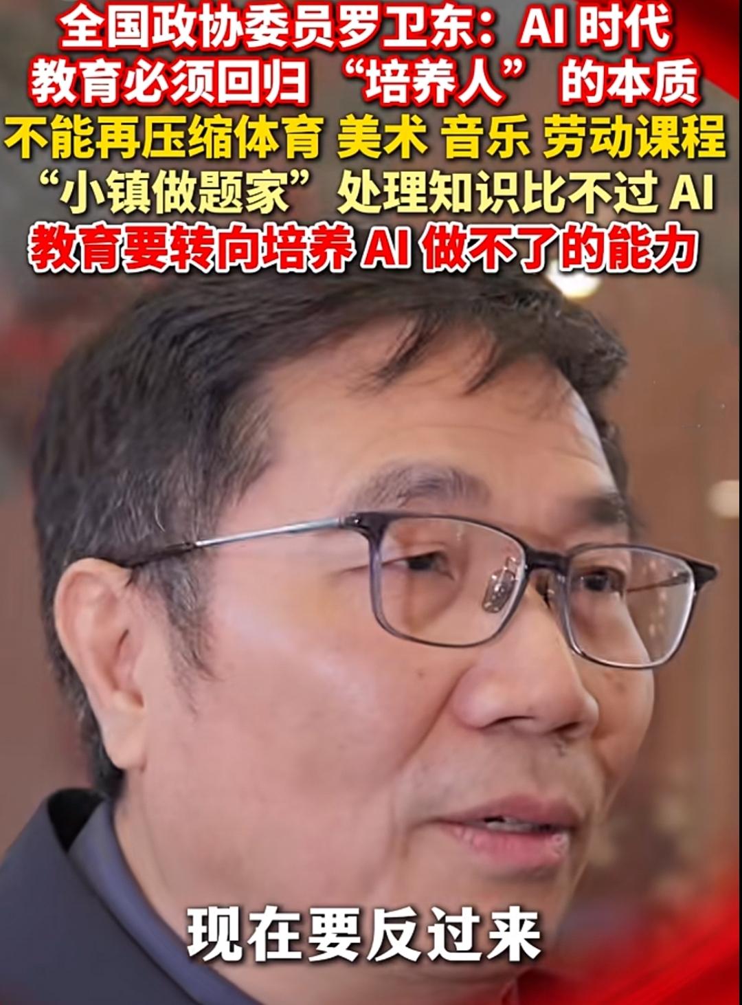 罗委员的观点恰逢其时,提得很好,我觉得这个观点可以扩大到大学教育!他们也同样面临ai的挑战。 而且这也不仅仅是教育领域面临的。但是在目前来看,应该是最紧迫的。 我们的孩子在逻辑思维,运算处理,知识记忆,已经落后于ai,这是铁定的现实,而且无法改变,所以不如主动面对和接受。 而我们的优势是什么呢?这又一下延续到人类这个称谓上。 可能就是我们与自然的交互能力,本质情感价值观,是我们最后的优势。