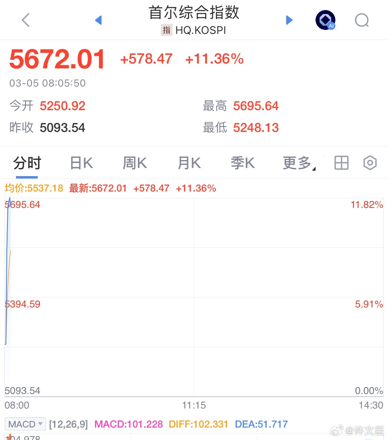 韩国综合股价指数(KOSPI)开盘上涨11%,至5655.25。 股市