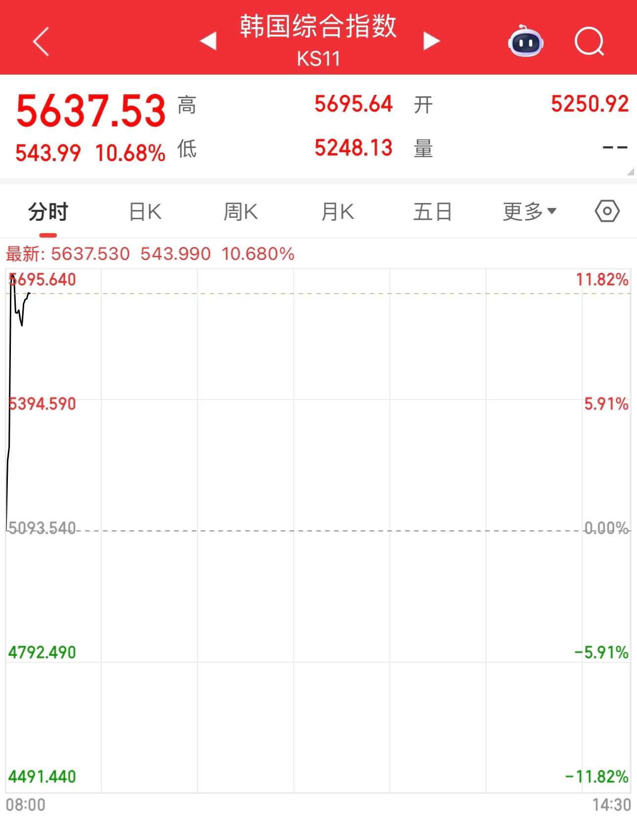 韩国股市和日本股市已经开盘了,韩国股市目前大涨10.68%,这涨幅不正常。日本股市涨3.65%。昨晚欧洲股市和美股都涨了。今天白天自然轮到亚洲股市涨。韩国和日本股市开了个好头。等会港股开盘,涨1.5%,总的涨吧。A股涨0.8%,要求不高吧。