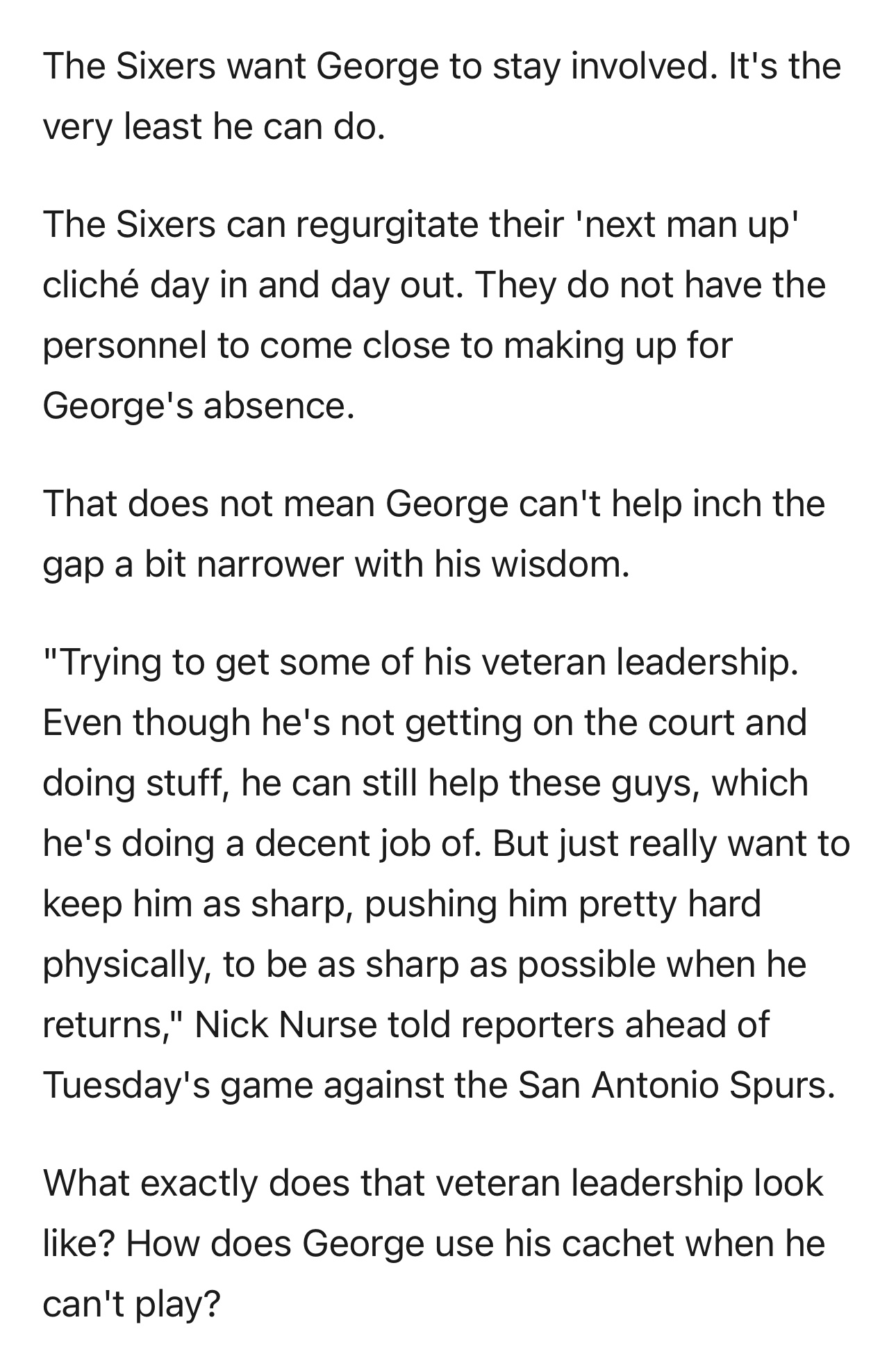 76人队可以日复一日地重复“下一个顶上”这句老生常谈,但他们现有的阵容根本无法弥补乔治缺席带来的损失。