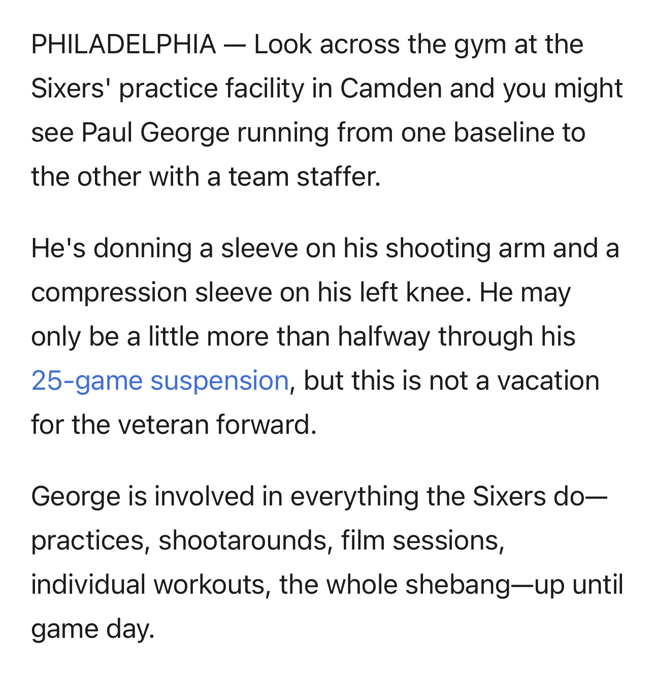乔治参与了76人队的所有活动安排——战术演练、投篮练习、录像分析、个人训练等等,只是在比赛日当天才会缺席。