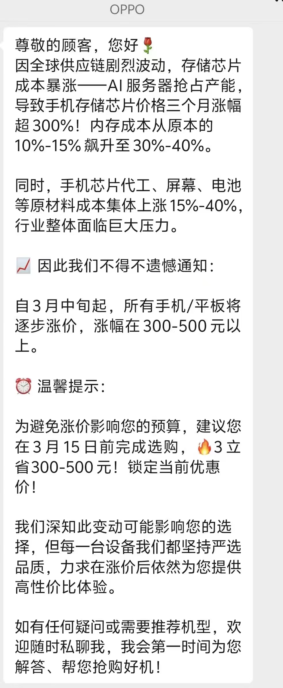 还有消息显示 OPPO 的全系产品,在 3 月中也将迎来涨价,涨幅在 300-500。