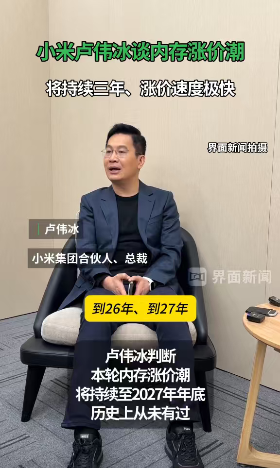先看海外品牌,三星 S26系列已经涨价了,标准版和Plus版直接涨了1000元,Ultra版本也上调了价格,这是全球手机市场涨价的明确信号。再看国内,小米产品经理已经公开表态,上游存储芯片成本暴涨,涨价是没办法的事,卢伟冰也直言这轮涨价周期会持续到2027年底。