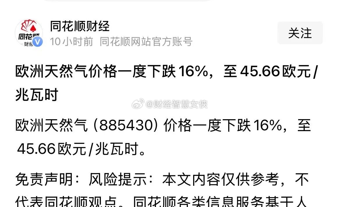 欧洲天然气价格一度暴跌16%,油气股今天注意风险:同花顺消息,昨晚石油价格冲高回落,天然气价格也大跌,欧洲天然气一度大跌了16%,这利空天然气板块。最终欧美天然气基准荷兰近月期货大跌!整体来看,3月5日开始,伊朗局势避险交易较弱,投资者也不宜追高任何油气板块,即便今天会震荡,明天周五大概率也会大面积跌停,投资者注意追高风险!