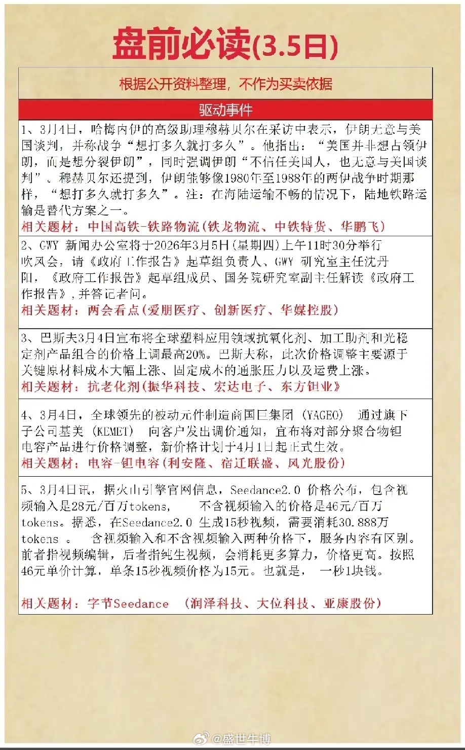 3月5日盘前必读今日盘前驱动事件清晰,呈现出“地缘催化+政策预期+产业涨价+AI技术落地”的多维共振:- 地缘催化:伊朗局势升级,海陆运输受阻,利好铁路物流替代方案,关注铁龙物流、中铁特货等。- 政策预期:《政府工作报告》吹风会召开,两会看点聚焦医疗、传媒等领域,关注爱朋医疗、华媒控股等。- 产业涨价:巴斯夫上调抗老化剂价格,国巨集团调整钽电容价格,成本传导下利好振华科技、利安隆等。- AI落地:字节Seedance2.0视频生成价格公布,算力需求提升,利好润泽科技、大位科技等。