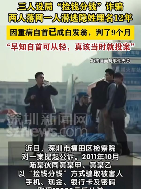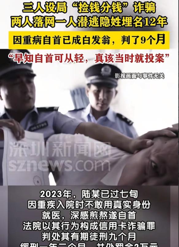 广东深圳,男子潜逃12年后,突发重病,却不敢用真实身份就医,最终选择自首。男子获刑9个月,缓刑1年2个月,并处罚金2万元后,追悔莫及:早知自首可以获得从轻处罚,我真该早点投案,也不用担惊受怕过这么多年。 2023年12月,在广东深圳的一个派出所里,一位白发苍苍的老人走进了大门,他就是陆某,那一年他已经70多岁,身上还带着未愈的重病。 面对民警,陆某的声音带着颤抖,也藏着解脱,他说自己逃了12年,终于敢来面对了,要是早知道自首能从轻处罚,他说什么也不会躲这么多年。 这位看起来可怜的老人,12年前也曾有过糊涂的一刻。 2011年10月9号,陆某和黄某甲和黄某乙兄弟俩,三个人凑在一起,动了歪心思,商量着用“捡钱分钱”的法子骗点钱花。 他们跑到街头,找了个人流不算少的地方蹲守,等有被害人经过的时候,黄某乙就故意假装不小心,掉出一沓大额面值的假外币,装作没发现就走开了。 紧接着,陆某和黄某甲就假扮成路人,假装刚好看到地上的钱,赶紧捡了起来,还故意让被害人也看到。 黄某甲趁机上前搭话,说这笔外币能换不少人民币,不如他们三个人一起把钱换成人民币,然后平分,被害人一时贪念起,就答应了下来。 就这样,三人以需要验证身份、先暂存财物等借口,骗走了被害人一部价值900元的手机,还有95元现金,另外还套走了被害人两张银行卡的密码。 被害人回过神来,才发现自己被骗了,赶紧报了警,警方很快就介入了调查。 没过多久,黄某甲和黄某乙先后被警方抓获,两人知道躲不过去,就如实交代了自己和陆某一起诈骗的全部事实,还把骗来的钱全部退还给了被害人。 最后,法院以信用卡诈骗罪,判处黄某甲有期徒刑一年,黄某乙有期徒刑九个月,两人服完刑后,就回归了正常生活,和普通人一样过日子。 而陆某,在得知同伙被抓的消息后,心里一下子就慌了,他害怕自己也会被判刑坐牢,就赶紧委托同伙的家属,把自己分到的那部分赃款退了回去,但他却没敢去派出所自首,而是收拾了简单的行李,开始了自己的潜逃生涯。 这一逃,就是12年,这12年里,陆某从来不敢用自己的真实姓名,不敢找稳定的工作,只能打零工勉强糊口,还不敢在一个地方久留,生怕被警方发现。 他每天都活在恐惧里,不管是听到警笛声,还是看到穿制服的人,都会吓得浑身发抖,就连晚上睡觉,也常常被噩梦惊醒,梦里全是警方追捕他的画面,还有被害人指责他的声音。 这12年,他不敢回家,不敢见自己的亲人,只能一个人漂泊,吃了上顿没下顿,身体也在常年的奔波和恐惧中慢慢垮掉。 他以为,只要自己跑得够远、藏得够深,就能躲过法律的惩罚,可他没想到,自己躲过的只是短暂的刑期,却换来了12年的颠沛流离和无尽煎熬。 2023年的那场重病,成了压垮陆某的最后一根稻草。 他躺在出租屋里,浑身疼痛难忍,想去医院看病,却连拿出身份证的勇气都没有,只能硬扛着,那一刻,他才彻底明白,逃避根本解决不了任何问题,反而让自己活得人不人鬼不鬼。 2023年12月16日,陆某终于鼓起勇气,拄着拐杖走进了派出所,主动向民警投案自首,如实交代了自己12年前参与诈骗的全部事实。 公安机关侦查终结后,就把这个案子移送至深圳市福田区检察院审查起诉,2025年10月11日,检察院依法以信用卡诈骗罪对陆某提起公诉。 法院审理后认为,陆某伙同他人骗取被害人银行卡后冒用,数额较大,其行为已经构成了信用卡诈骗罪,但考虑到他主动投案自首,如实供述自己的罪行,还主动退缴了赃款,依法可以从轻处罚。 最终,法院判处陆某有期徒刑九个月,缓刑一年二个月,并处罚金2万元。 拿到判决书的那一刻,陆某再也忍不住,老泪纵横,他一遍又一遍地感慨,要是自己早点自首,就不用白白担惊受怕12年,也不用落得重病缠身的下场。 其实,人这一辈子,谁都有可能犯糊涂,但犯了错并不可怕,可怕的是不敢面对,不敢承担。 遵守道德和法律法规,是每个人的底线,犯了错主动认错改正,才能真正获得解脱,也才能过上安稳的日子。