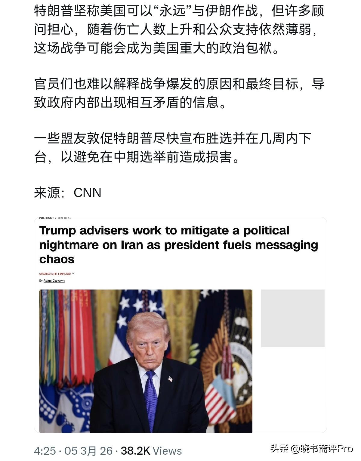 特朗普面对内部压力了!特朗普的政治盟友们敦促特朗普见好就收!3月5日,根据美国有线电视新闻网报道,美媒称,尽管川普坚称美国可以“永远”与伊朗作战,但许多顾问担心,随着伤亡人数上升和公众支持仍然薄弱,这场战争可能成为一个重大的政治负担。 官员们也在努力解释这场战争为何开始,以及最终结局是什么,这导致了政府内部相互矛盾的信息。一些盟友正在敦促特朗普迅速宣布胜利,并在几周内退出,以避免在中期选举之前造成损害。很显然,从美国政坛的情况来看,对于美国打击伊朗的进展,就算是特朗普的支持者也感到很焦虑。 为什么他们劝特朗普见好就收呢?一句话,随着战争的持续,如果美国死伤越来越多,军事基地受损越来越重,特朗普将很难对美国国内交代,而这将不利于中期选举。事实上,特朗普发动对伊朗的打击,其目的之一就是要提振支持率,转移国内矛盾,掩盖爱泼斯坦事件丑闻,塑造其战时总统的强硬形象。 但是,现在战争的走向已经明显不受美国控制。盟友催他“见好就收”,正是看清了局势的不利变化,弄不好美国会把自己陷进去。到时候特朗普所谓的“胜利人设”会彻底破产,原本用来遮羞的战争,弄不过会变成美国的拖累以及政治负资产,而事实上,美国国内大多数人并不支持这场战争。但时候,特朗普搞不好会弄巧成拙,变成自己给自己挖坑了。