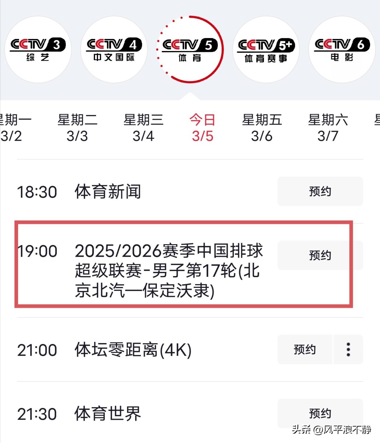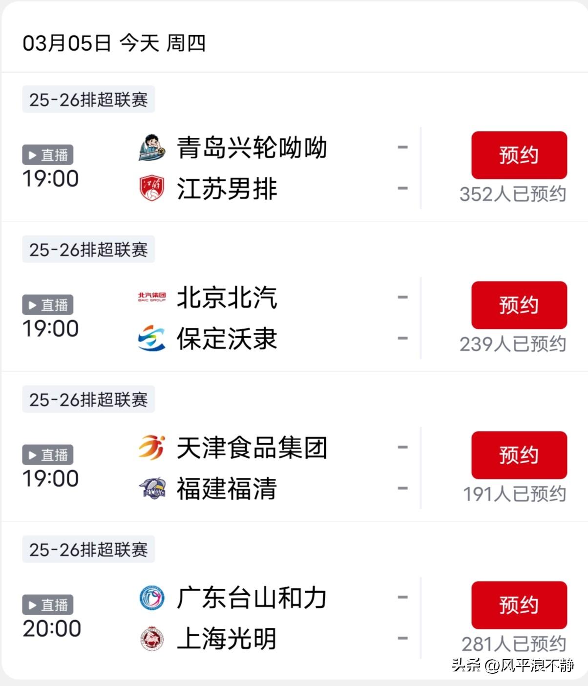 男排季后赛第三轮CCTV-5直播!(3.5) 25-26赛季男排季后赛第三轮,今晚19点进行,CCTV-5将直播北京—保定的比赛,其他场次央视频直播,具体赛程安排如下∶ 3月5日 周四 19∶00 山东—江苏(央视频直播) 19∶00 北京—河北(CCTV-5直播) 19∶00 天津—福建(央视频直播) 19∶00 广东—上海(央视频直播)