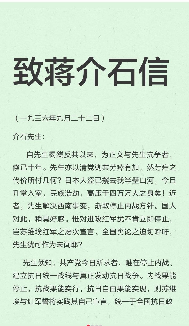 这是西安事变之前几个月我党致蒋介石的一封信,既表明了我党一贯抗日的立场,又委婉奉劝蒋以民族大义为重建立抗日统一战线。 此信让国人了解了共产党,也感化了不少国民党高级军官,也促成了最终的西安事变和平解决。