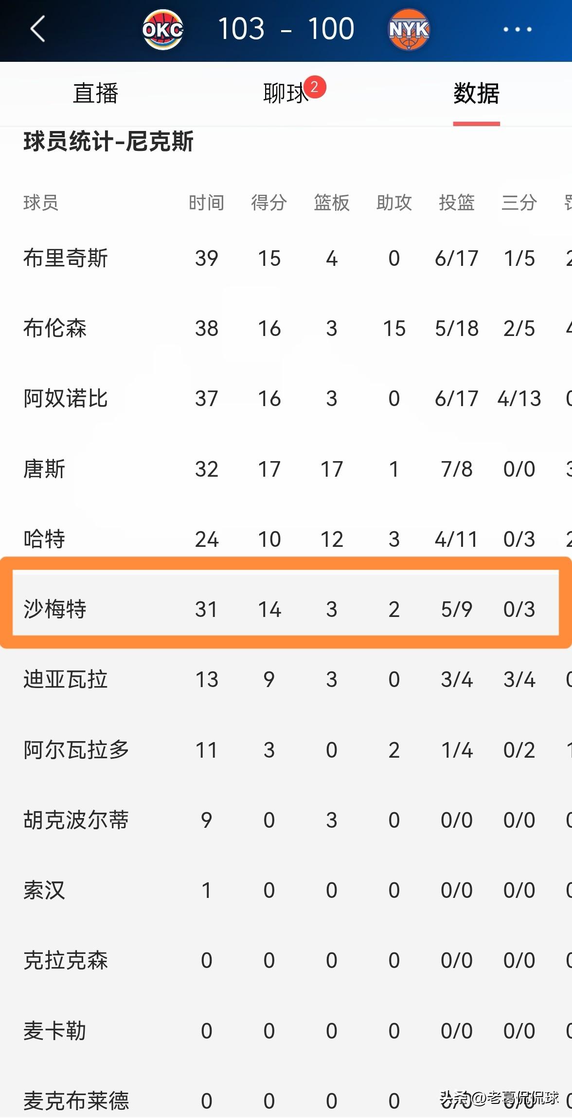 尼克斯大将沙梅特真是便宜又好用!虽然今天尼克斯在主场以100:103不敌卫冕冠军