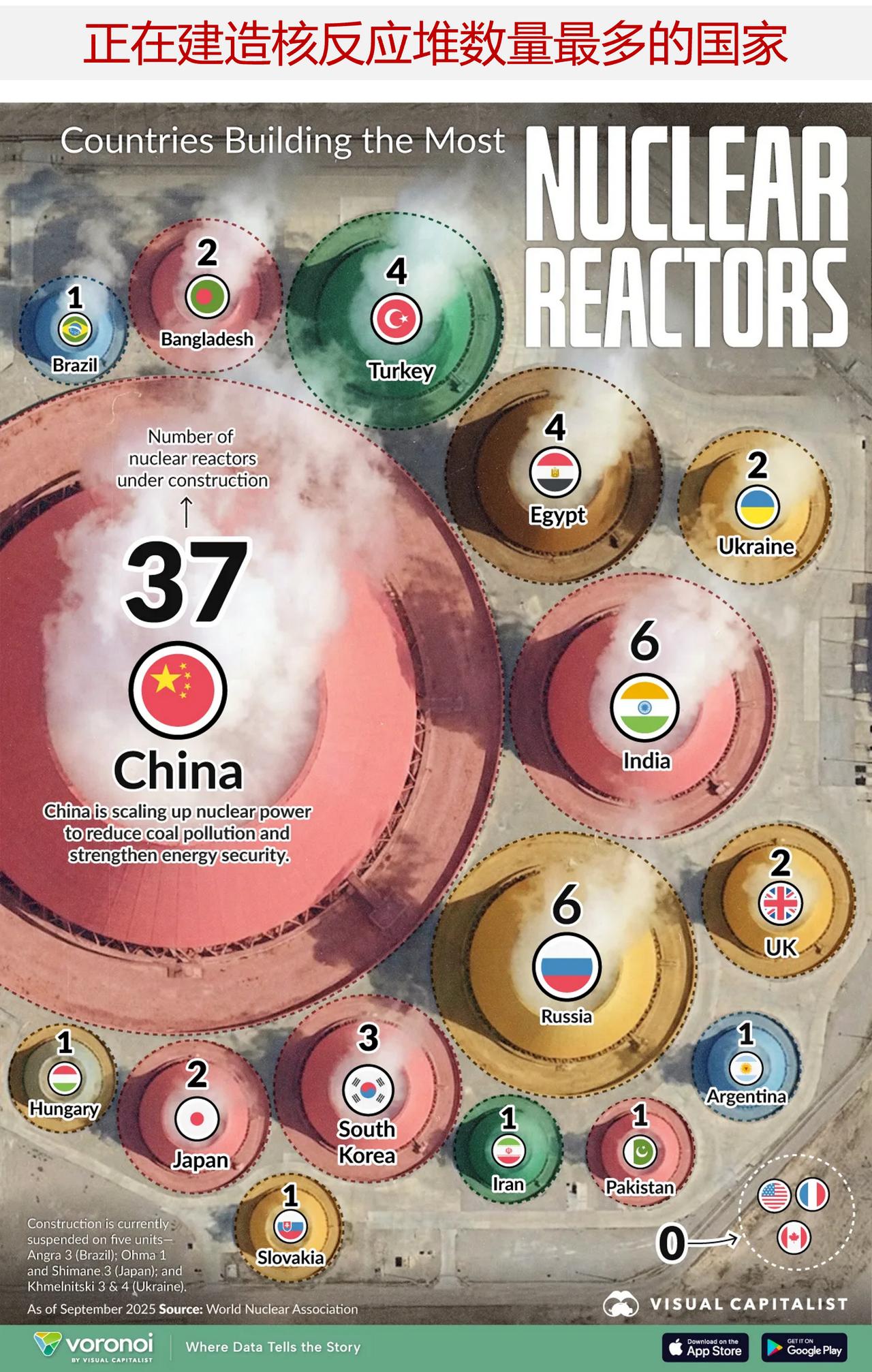 中国正处于全球规模最大的核电站建设热潮之中 中国各地正在兴建数十座核反应堆,这些反应堆将带来近 430 亿瓦的新增发电容量。单这一项建设规模就超过了目前世界上所有其他国家正在建设的总和。 下面图表详细列出了 2025 年哪些国家正在扩大核能发电规模。该数据来自世界核能协会。 ——中国大规模的核能建设 目前中国有 37 座核反应堆正在建设中,其新增发电容量约为 42.9 吉瓦(GW)。 这比印度或俄罗斯正在建设的产能总和还要高出六倍之多,而这两个国家是紧随其后的两个国家。 随着电力需求的不断增长以及老旧发电设施的退役,核能的扩张将在塑造长期能源安全和电网稳定性方面发挥决定性作用。 大多数反应堆最初获得的运行许可期限为约 40 年,不过许多经过升级和维护后会获得延长至 60 年甚至 80 年的许可。随着老旧核电站的使用寿命接近尾声,需要新建反应堆来取代即将退役的产能,以保障电网稳定,并帮助各国实现长期的减排目标。 ——印度和俄罗斯位居第二位 印度和俄罗斯并列第二,各自有六座核反应堆正在建设中。印度的项目总容量为 5.2 吉瓦,略高于俄罗斯的 4.2 吉瓦。 此后,相关活动便迅速放缓。埃及和土耳其各有四座反应堆正在建设中,而其他大多数国家则只在建造一座或两座。 此后,相关活动便迅速放缓。埃及和土耳其各有四座反应堆正在建设中,而其他大多数国家则各在建造一座或两座。 值得注意的是,一些已确立地位的核大国并未出现在该名单之中。截至 2025 年 9 月,美国、法国和加拿大均无在建核反应堆。