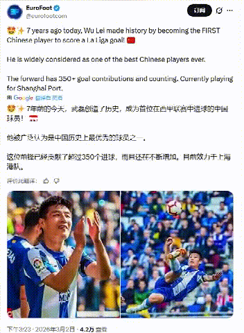武磊的成绩被国外的大V博主这么看待,他被广泛认为是中国历史上最优秀的球员之一。
