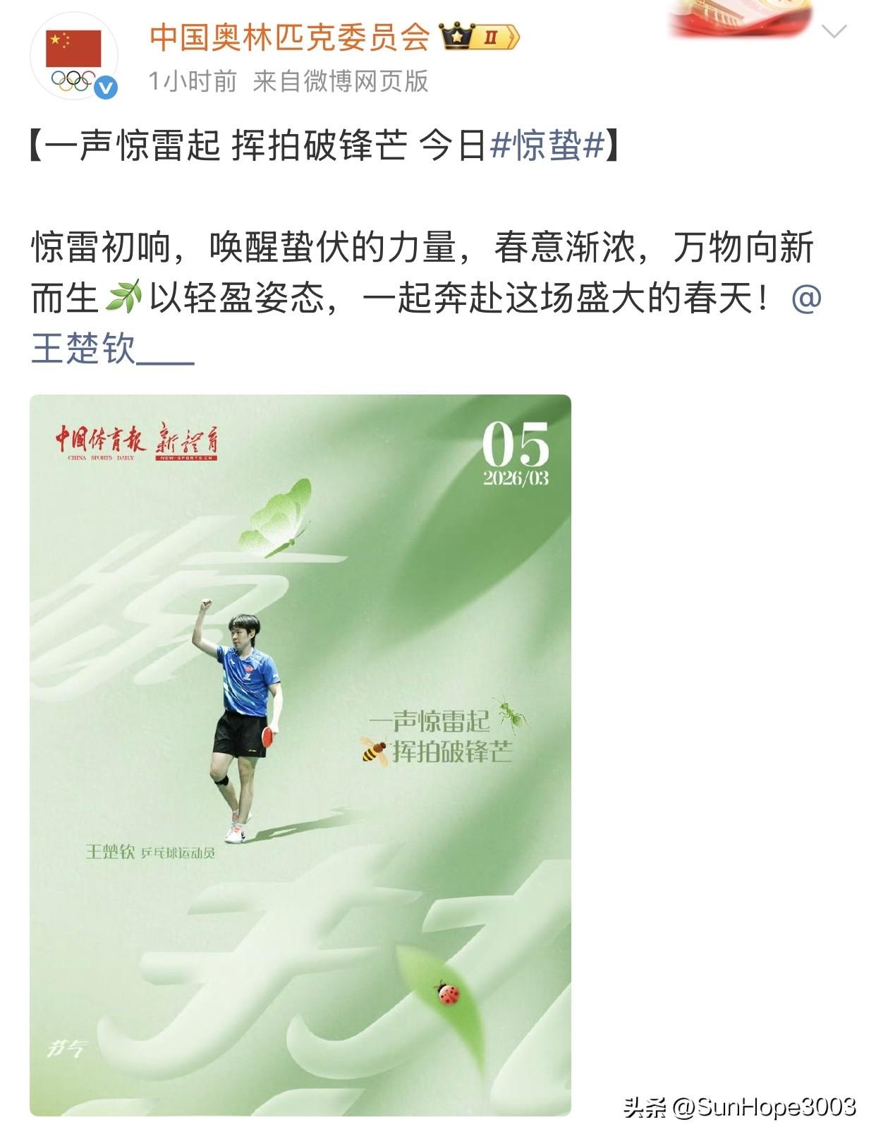 今日惊蛰,中国奥林匹克委员会发文王楚钦,一声惊雷起,挥拍破锋芒。 新节气,新气象,惊蛰之后,万物复苏,春天真的要来了,一切的美好即将到来。 刚刚中国奥林匹克发文,艾特王楚钦,以王楚钦为首,开启新的节气, 运动员一切以传递体育精神为重,赛场下的刻苦努力,赛场上的不畏困难,敢打敢拼,都是榜样。 愿所有运动员都健康完赛!