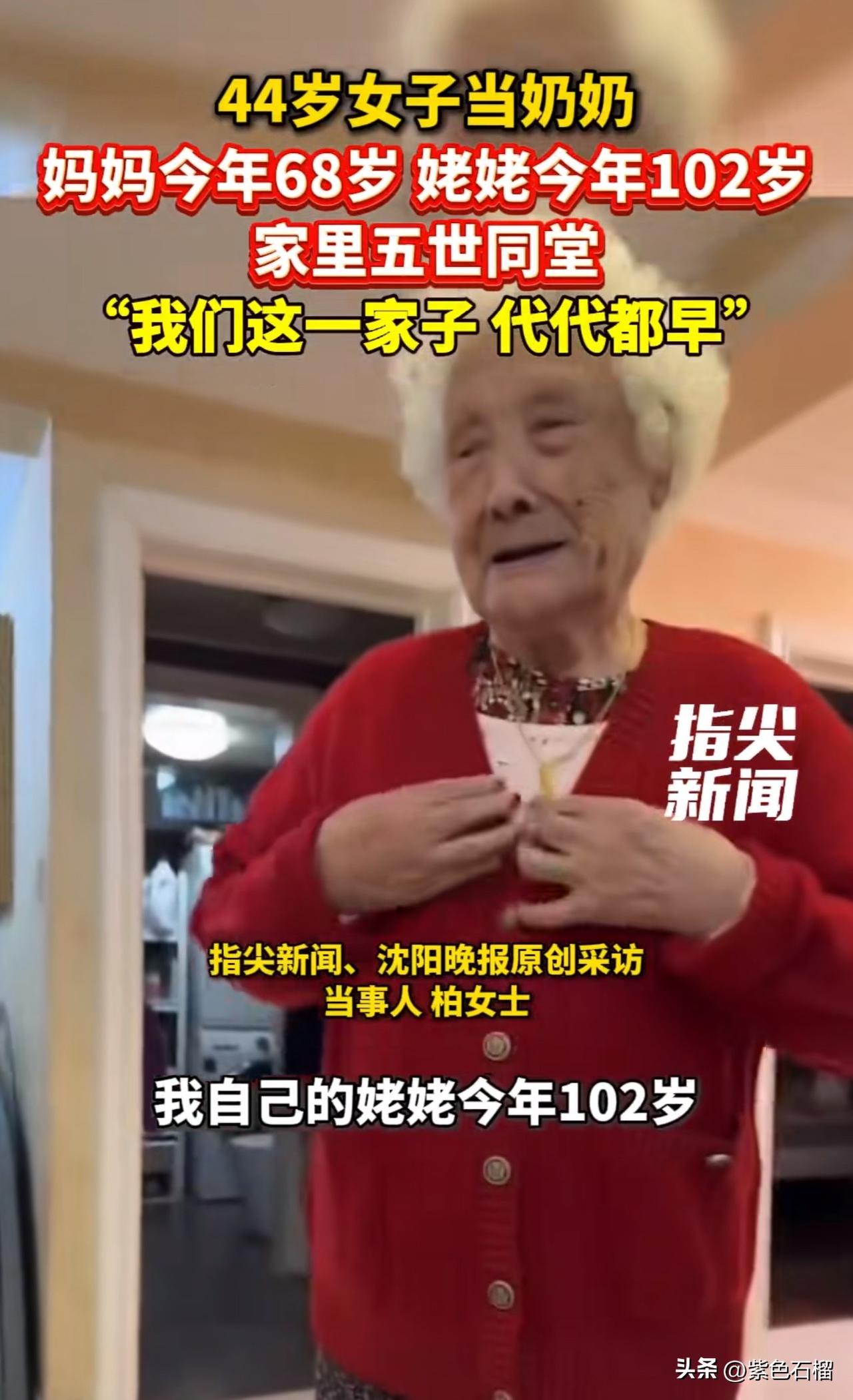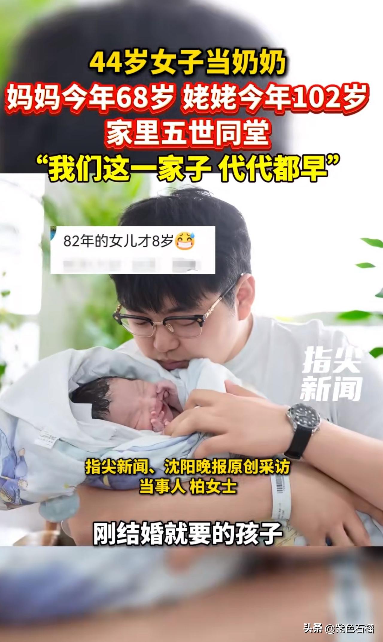 真让人羡慕!辽宁一位80后女子竟当上了奶奶。 近日在辽宁沈阳,44岁的柏女士已然成为奶奶。关键是,她的妈妈今年才68岁,姥姥今年102岁且依然健在,这妥妥是五世同堂啊! 据当事人柏女士介绍,她是1982年出生的,儿子2004年出生,刚结婚就要了孩子。她表示,当奶奶的心情开心得难以言表,天天抱着宝宝都舍不得放下。 对此,有网友评论:“神奇的80后,有结婚的,有离婚的,有未婚的,还有当奶奶的。” 还有网友说:“80后还在纠结生二胎、三胎时,44岁的都开始‘卷’孙子了。” 真是人比人气死人,80后的朋友们,你们的孩子都多大了?欢迎在评论区交流。 (图片来源网络)