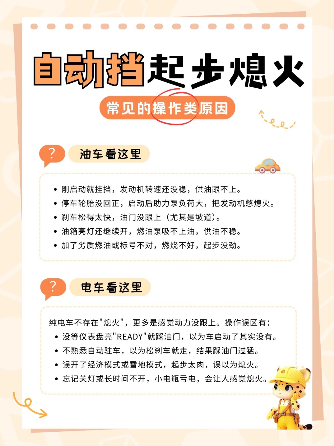 💨自动挡起步熄火?先别急着修车!可能是你开车的小问题,也可能是车真的出故障了,一篇帮你理清楚👇车主开车问题⛽油车:刚启动就挂挡、车轮没回正起步 、刹车松太快、油箱亮灯硬开、加了劣质油等。🔋电车:没等READY灯亮、不熟悉自动启停、误开经济模式、小电瓶亏电等。汽车故障问题⛽油车:积碳、油路堵、点火弱、电压不稳、传感器抽风等。🔋电车:电池没电、BMS乱判、控制单元故障、线路短路等。大v聊车汽车