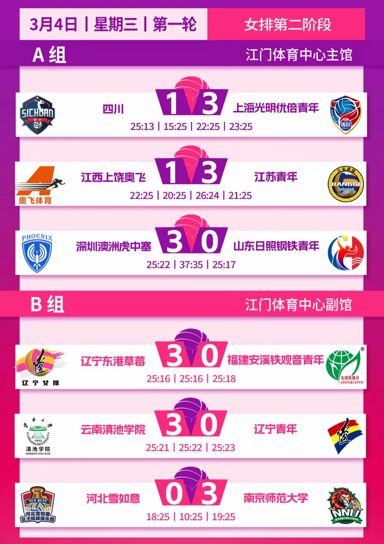 辽宁男排和辽宁女排都取得了3:0的战绩迎来了第二阶段第一轮开门红
