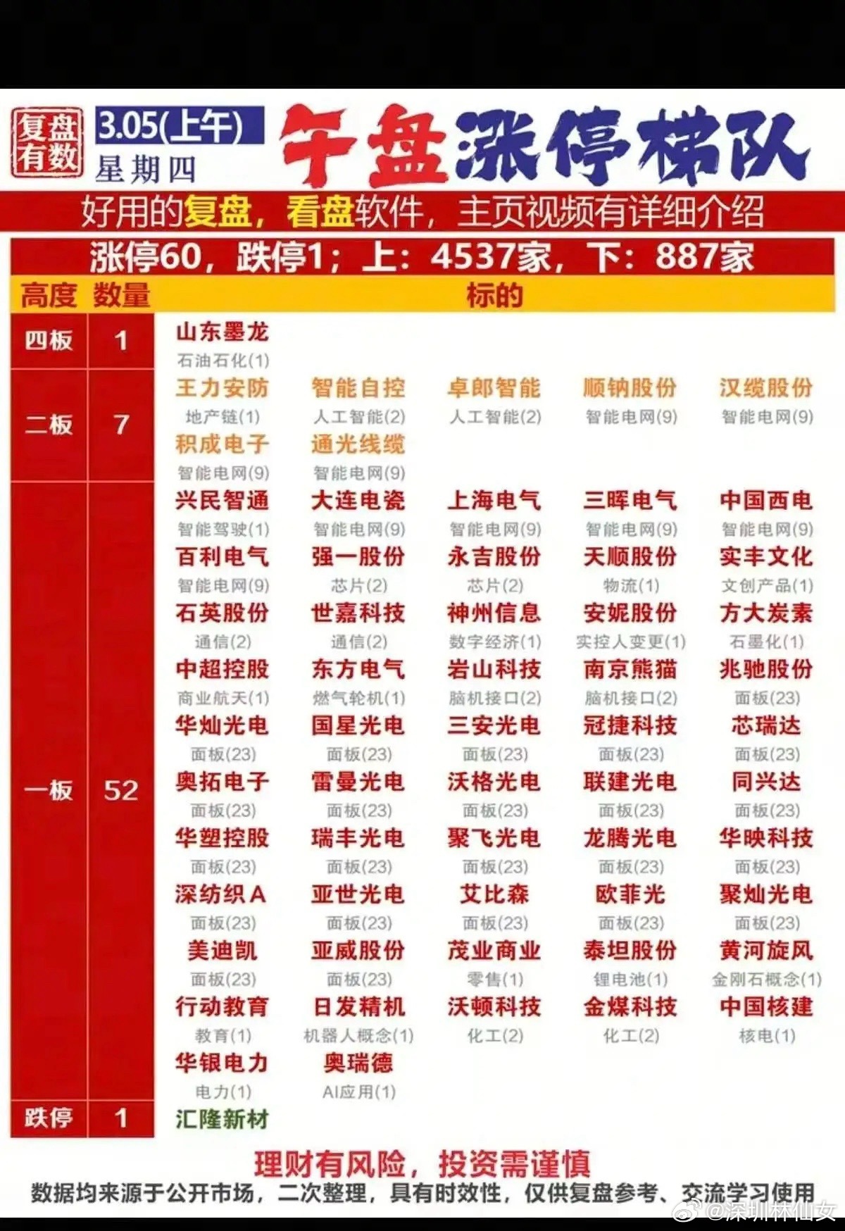 今日A股市场情绪显著回暖,涨停家数达60家,跌停仅1家,上涨个股4537家,下跌887家。涨停梯队结构清晰:四板仅山东墨龙(石油石化),二板聚焦智能电网、人工智能等主线,一板则以面板(23家)、智能电网(9家)为绝对核心,题材集中度高,资金抱团特征明显,智能电网、面板、脑机接口等成为市场主线。涨停个股梳理1. 山东墨龙(四板,石油石化):油气板块龙头,受益于油气勘探开发提速及油价波动,资金持续流入,连板高度打开,带动油气板块整体情绪。2. 王力安防(二板,地产链):地产链家居标的,受益于地产政策宽松及家居消费复苏,订单稳步增长,资金流入推动估值修复。3. 卓郎智能(二板,人工智能):AI+纺织机械企业,受益于AI在制造业的应用拓展,技术升级带动效率提升,资金流入支撑股价上行。4. 顺钠股份(二板,智能电网):智能电网设备企业,受益于电网投资加码及智能电表需求增长,订单充足,资金流入推动业绩兑现。5. 汉缆股份(二板,智能电网):智能电网电缆龙头,受益于特高压及电网建设提速,电缆需求旺盛,资金流入支撑产能扩张。6. 积成电子(二板,智能电网):电网自动化企业,受益于智能电网建设及电力信息化需求提升,技术研发投入加大,资金流入推动成长。7. 通光线缆(二板,智能电网):特种线缆企业,受益于电网及新能源建设,特种线缆需求增长,资金流入支撑订单交付与产能提升。8. 兴民智通(二板,智能驾驶):智能驾驶标的,受益于车联网及自动驾驶技术发展,业务拓展加速,资金流入推动估值提升。9. 大连电瓷(一板,智能电网):绝缘子企业,受益于特高压及电网建设,绝缘子需求增长,资金流入支撑产能扩张与市场拓展。10. 上海电气(一板,智能电网):电力装备龙头,受益于能源转型及电网投资加码,海外业务拓展顺利,资金大幅流入推动股价上行。11. 三晖电气(一板,智能电网):电能计量设备企业,受益于智能电网建设,智能电表需求提升,资金流入支撑订单增长与技术升级。12. 中国西电(一板,智能电网):特高压龙头,受益于电网投资加码及海外市场拓展,订单充足,资金流入推动业绩与估值双升。13. 百利电气(一板,智能电网):输配电设备企业,受益于智能电网建设,设备需求提升,资金流入推动技术研发与市场份额扩大。14. 强一股份(一板,芯片):芯片材料企业,受益于半导体国产化进程加速,材料需求增长,资金流入支撑研发投入与产能扩张。15. 永吉股份(一板,芯片):芯片封装材料企业,受益于半导体行业复苏,封装材料需求提升,资金流入推动产能释放与客户拓展。16. 天顺股份(一板,物流):物流企业,受益于供应链优化及跨境物流需求增长,业务拓展加速,资金流入支撑估值修复。17. 实丰文化(一板,文创产品):文创产品企业,受益于消费复苏及IP衍生业务发展,需求增长,资金流入推动业务扩张。18. 石英股份(一板,通信):石英材料企业,受益于光通信及半导体需求增长,石英材料供应提升,资金流入支撑产能扩张。19. 世嘉科技(一板,通信):通信设备企业,受益于5G及算力网络建设,设备需求增长,资金流入推动订单交付与市场拓展。20. 神州信息(一板,数字经济):数字经济企业,受益于金融科技及数字政务建设,业务拓展加速,资金流入推动估值提升。21. 安妮股份(一板,实控人变更):版权服务企业,受益于实控人变更带来的资源整合,业务预期改善,资金流入推动股价上行。22. 方大炭素(一板,石墨化):石墨电极企业,受益于钢铁行业复苏及新能源电池需求,石墨化材料供应增长,资金流入支撑产能扩张。23. 中超控股(一板,商业航天):电缆及新材料企业,受益于商业航天及电网建设,特种电缆需求增长,资金流入支撑订单交付。24. 东方电气(一板,燃气轮机):能源装备龙头,受益于能源转型及燃气轮机需求增长,订单充足,资金流入推动业绩增长。25. 岩山科技(一板,脑机接口):脑机接口企业,受益于脑机接口技术突破及AI算力布局,题材热度高,资金流入推动股价上涨。总结今日午盘,市场情绪大幅回暖,涨停梯队结构清晰,资金向具备政策支持、业绩增长确定性的赛道(如智能电网、面板、脑机接口)集中抱团。四板由山东墨龙领衔,二板聚焦核心主线,一板则以面板、智能电网为绝对主力,题材广度与连板高度均有所提升。后续需关注主线持续性及资金轮动节奏,把握高确定性赛道的机会。