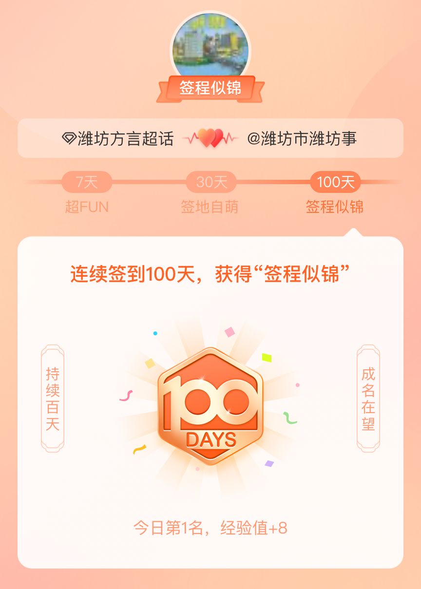 潍坊方言我在潍坊方言连续签到100天,获得了“签程似锦”头衔。心中有光,奔赴热爱