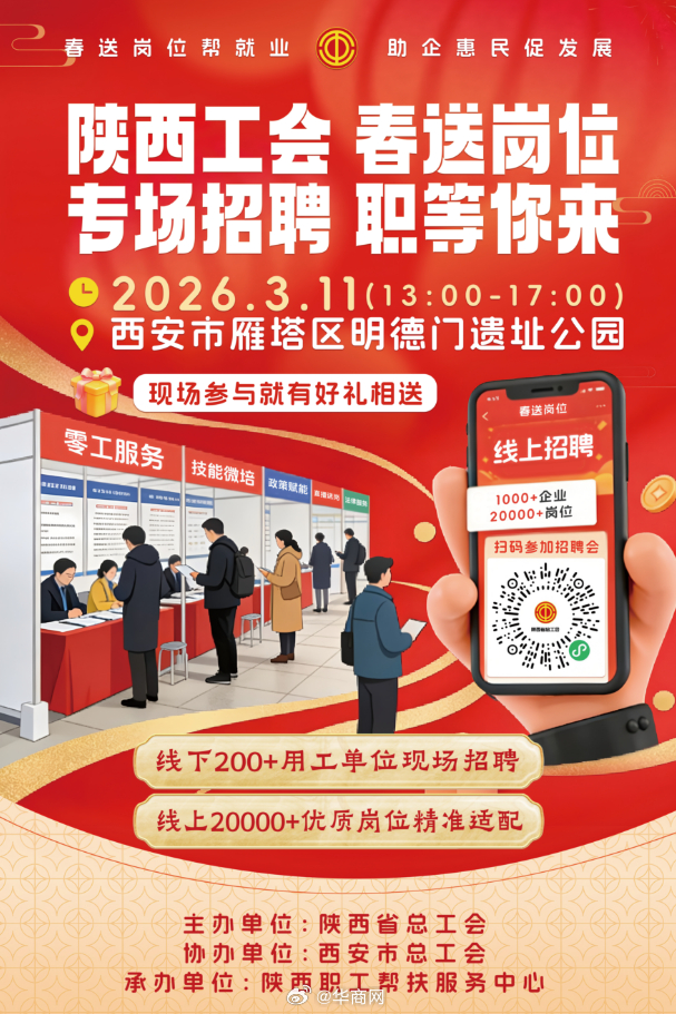【陕西工会大型招聘会这些重磅企业等你投简历】2026年陕西工会就业服务月“春送岗位”大型招聘会3月11日开启,西安市雁塔区明德门遗址公园广场将化身求职者的“梦想舞台”,200余家优质企业、超2万个就业岗位虚位以待,这些重磅企业等你投简历:陕西汽车控股集团有限公司、西安纺织集团有限责任公司、比亚迪汽车工业有限公司、西安迪赛生物药业有限责任公司、京东物流、西安市糖酒集团有限公司、中兴通讯股份有限公司、陕西华夏文旅发展有限公司……线上招聘1000多家企业参与,提供超过20000个就业岗位,打造“不打烊”线上招聘会。长按海报二维码登录陕西省总工会云人才市场,在线投递简历。#陕西2026春季招聘推出千家企业上万岗位#