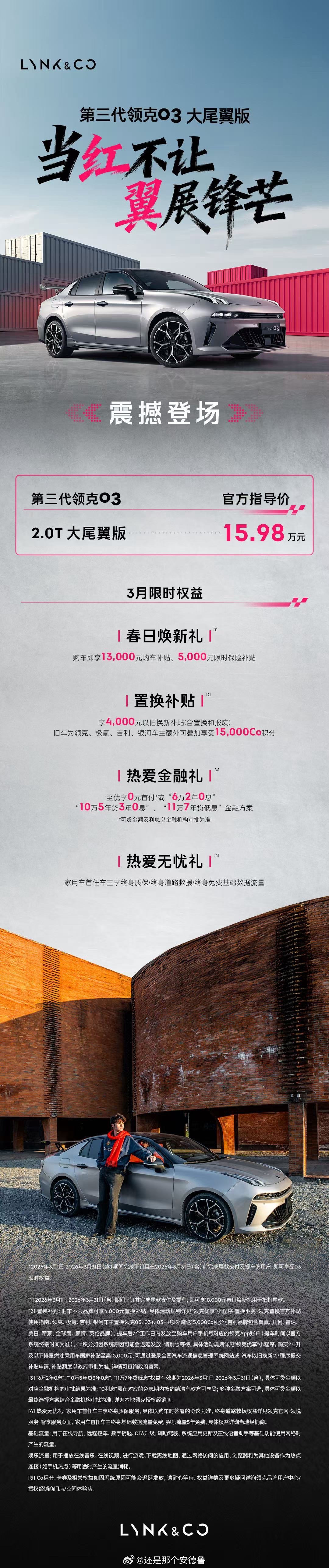 3月5日,第三代领克03大尾翼版正式上市,官方指导价15.98万元,三月购车可享春日焕新补贴、置换补贴及金融福利。新车搭载东丽碳丝打造的三段可调碳纤维尾翼,配19英寸锻造轮毂与炽热红内饰,动力上采用2.0TD T5 Evo+爱信8AT组合,零百加速6.5秒,还搭载LYNK Flyme Auto车机系统。该车承袭领克TCR“七年九冠”冠军血统,是领克实现性能平权的新举措,进一步推动中国性能车文化发展。这届年轻人选车都看中什么