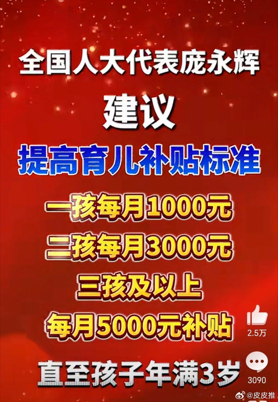 建议三孩每月补贴5000元至3岁专家建议,提高育儿补贴标准,覆盖全成长周期,建议调整补贴政策,给予一孩每月1000元、二孩每月3000元、三孩及以上每月5000元补贴,直至孩子年满3岁。那么一孩二孩三孩家庭分别能获得多少补贴?