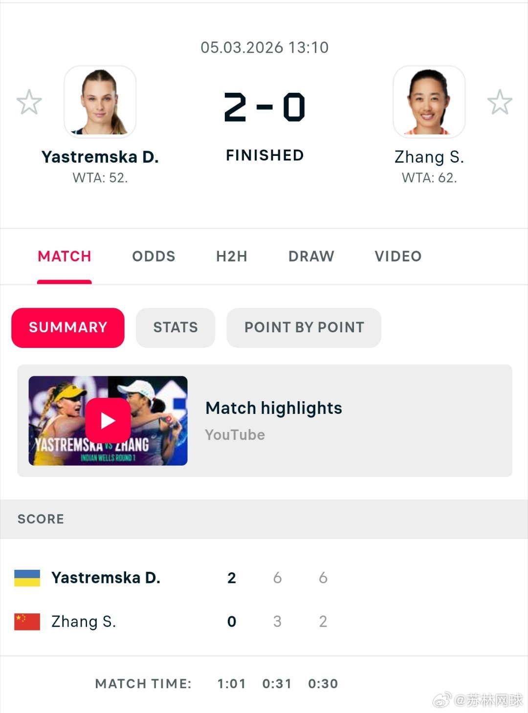 🇨🇳张帅3-6/2-6不敌雅斯特列姆斯卡🇺🇦止步印第安维尔斯首轮。接下来
