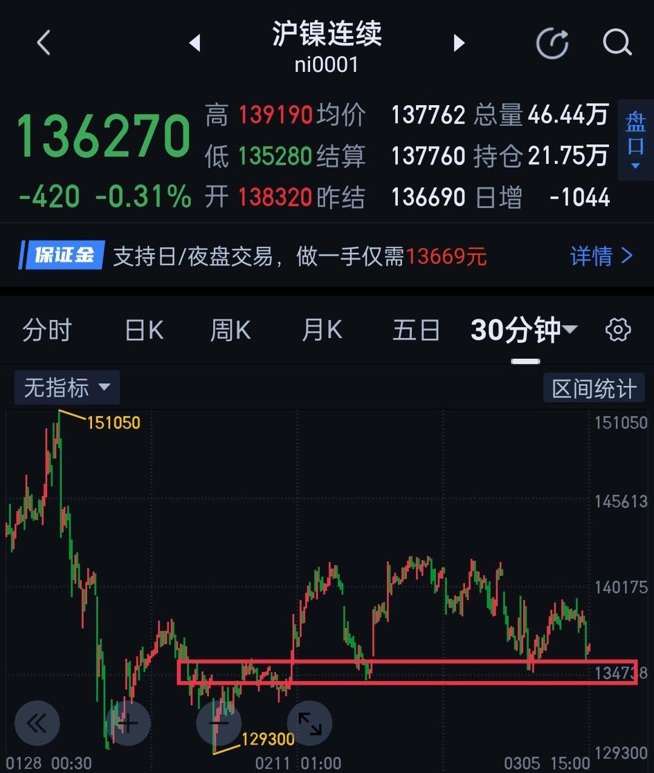 沪镍,日盘下破图(1)的一分钟中枢。夜盘,需观察能否形成对该中枢的三卖结构。如未形成三卖,暂用中枢延续的视角跟随。如三卖形成,要防止引发沪镍下破图(2)的五分钟中枢,继而向129300寻求支撑的可能。