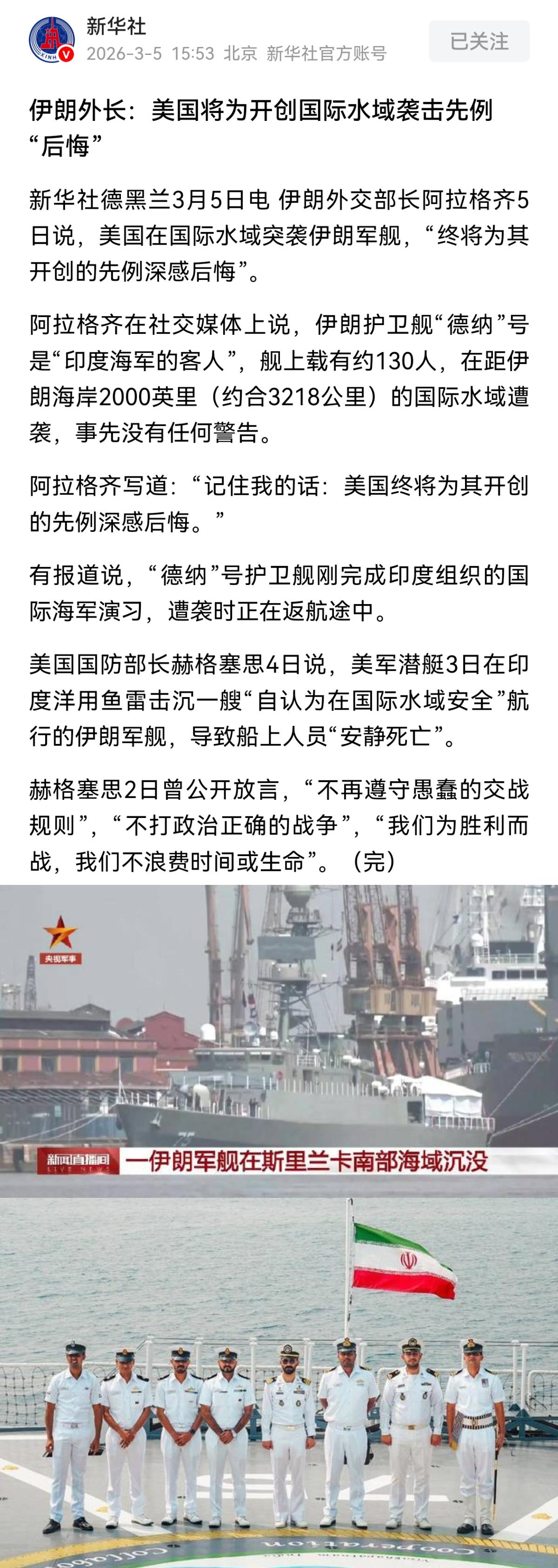 美军潜艇在距离伊朗海岸3200公里的斯里兰卡附近国际水域,击沉一艘伊朗军舰,舰上130人,只30多人被斯里兰卡救起,目前87人牺牲。美国战争部为了吹嘘战功,草菅人命,伊朗外长表示,赫格赛思你一定会后悔的。
