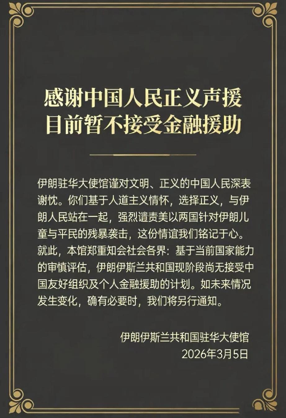 伊朗驻华大使馆发布声明 对中国人民给予的友好支持致以诚挚感谢,现阶段暂不接受个人及组织的金融援助 若后续条件允许,将另行发布通知