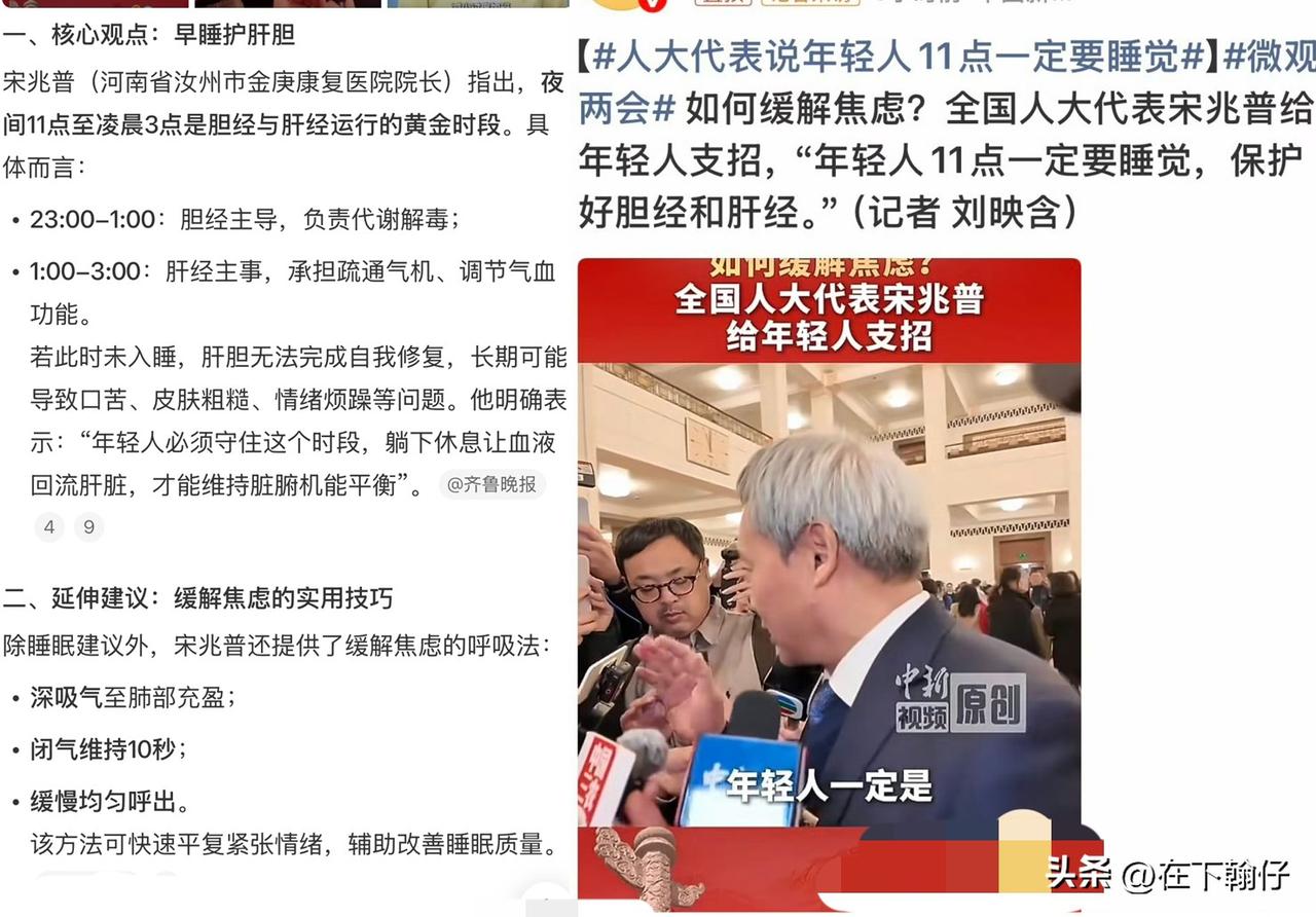 全国人大代表、医生宋兆普忠告:年轻人,晚上11点前请放下手机! “熬夜伤肝、伤情绪、毁颜值,身体垮了,一切都晚了。” 这句听起来有些严厉的话,不是来自家里的长辈,而是出自全国人大代表、著名中医宋兆普医生之口。在今年两会上,他关于“年轻人尽量在晚上11点前睡觉”的建议,迅速冲上热搜,引发了无数人的共鸣和讨论。 宋医生的建议背后,是深厚的中医理论支撑:从晚上11点到凌晨3点,是胆经和肝经当令的黄金时段。此时,人体需要进入深度睡眠,以护胆经、养肝血。 简单来说,这段时间,是你身体里那个最忠诚、最智能的“修复工厂”开启全员加班模式的时候。它帮你清理白天堆积的“情绪垃圾”,修复受损的细胞,给你的颜值“充电”,为第二天的精力“储备粮草”。 所以说,睡个好觉,真的比用再多昂贵的护肤品都管用。 它能让你由内而外透出好气色,比任何粉底都自然;它能稳定你的情绪,让你在面对生活的一地鸡毛时,依然能心平气和。 道理我们都懂,为什么就是做不到?评论区里,大家的心声出奇地一致:不是不想睡,是真的“身不由己”。 有人为了生计,在深夜的写字楼里加班加点,PPT改了一版又一版; 有人在深夜的急诊室里忙碌穿梭,守护着别人的健康,却透支着自己的; 有人被孩子的哭声一次次从睡梦中唤醒,哄睡、喂奶,天亮后还要继续“战斗”; 还有人,只是想在被工作与生活挤压得所剩无几的时间里,喘一口气,哪怕只是漫无目的地刷着手机,也感觉这时间才是真正属于自己的。 单纯地强调“必须”,对那些想睡却不能睡、想睡却睡不着的人来说,无异于一种无形的压力和指责。它会让人产生深深的自责和焦虑:“我怎么又没做到?”“我是不是在自我毁灭?”而这种焦虑,让你陷入越想睡越睡不着的恶性循环。 真正的解药,是“减少内耗”和“放过自己”。宋医生的建议是一个温柔的提醒。提醒我们在身不由己的现实里,尽可能地为自己争取一点主动。 能早睡,是福气。 如果你的工作生活允许,那么恭喜你,请在11点前放下手机,关掉屏幕,好好享受这份身体给你的馈赠。这比任何养生药方都管用。 实在做不到,也别过度自责。 如果今晚必须加班,那就专注地把工作做完,然后告诉自己:“我已经尽力了,现在需要休息。”如果今晚带娃实在睡不成片,那就抓住宝宝睡着的间隙,赶紧补一觉,而不是坐在那里懊恼。 从今天起,试着做出一点点改变:少熬一点无意义的夜,少刷几分钟制造焦虑的视频;把睡前的时间还给自己,泡个脚,听会音乐,读几页书;慢慢调整作息,哪怕每天提前10分钟上床,也是巨大的进步。 你昨晚是几点睡的?是什么让你舍不得或不得已放下手机?欢迎在评论区留言分享。