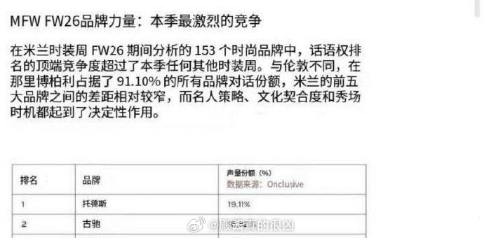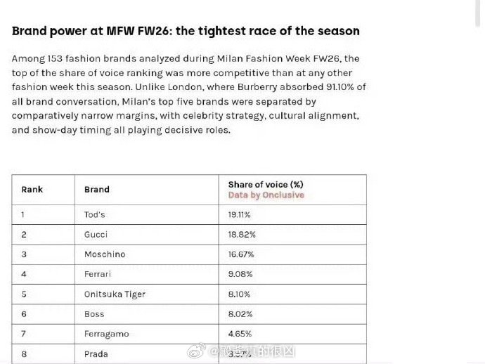Onclusive 全球性媒体发布2026米兰时装周共153个品牌市场声量份额排行榜,竞争十分激烈,其中肖战代言的TODS和GUCCI声量份额分别排名第一第二。不愧是巨星肖战好强的国际影响力!!👍