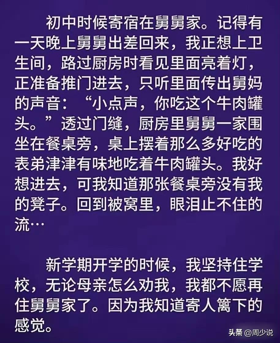 “看哭无数人!”这是一位初中生的真实故事,因家庭原因,常年寄宿在舅舅家。懂事的他,从小就学着小心翼翼,生怕给亲戚添一点麻烦。可谁也没想到,一个普通的夜晚,厨房那一幕,彻底戳碎了他心底的防线。 那天夜里,舅舅出差归家,男孩正要去卫生间,路过厨房时,灯还亮着。刚想推门,里面传来舅妈的轻声叮嘱:“小声点,快吃这个牛肉罐头。” 透过门缝,他看见舅舅一家人围坐桌边,饭菜丰盛,表弟正开心地吃着罐头。那一刻,他站在门外,清清楚楚地明白:那张热闹的餐桌,从来没有属于他的位置。 他默默转身,回到房间,蒙住被子,眼泪无声地落了下来。 新学期开学,无论母亲怎么劝说、挽留,男孩都坚持住校,再也不肯回舅舅家。不是不懂感恩,而是寄人篱下的滋味,太委屈,太煎熬。 此事在网上引发热议,有网友说:“太懂这种感受了,亲戚再好,也不是自己家,懂事的孩子最让人心疼。” 还有网友表示:“孩子的自尊很脆弱,父母别轻易把孩子托付给别人。” 其实,这件事,周少觉得值得每一位家长深思。亲戚的照顾,终究替代不了父母的陪伴;暂时的安顿,也抚平不了孩子内心的不安。 孩子看似沉默乖巧,心里却格外敏感,每一处都变得小心翼翼,他们怕添麻烦,怕被嫌弃,更怕自己是多余的那一个。 很多家长总觉得,有亲戚照看就足够安心,实际上却忽略了孩子最需要的,是归属感。寄人篱下的成长,会悄悄磨掉孩子的自信,让他变得胆怯、敏感、自卑。 说直白点,比起物质上的照料,给孩子一个安稳、属于自己的小家,一份踏实的安全感,才是教育里最不能缺失的东西。别让懂事的孩子,在本该被疼爱的年纪,独自咽下委屈。 对于这个故事,大家看完后有什么感受?#寻美三湘# #周少说教育#