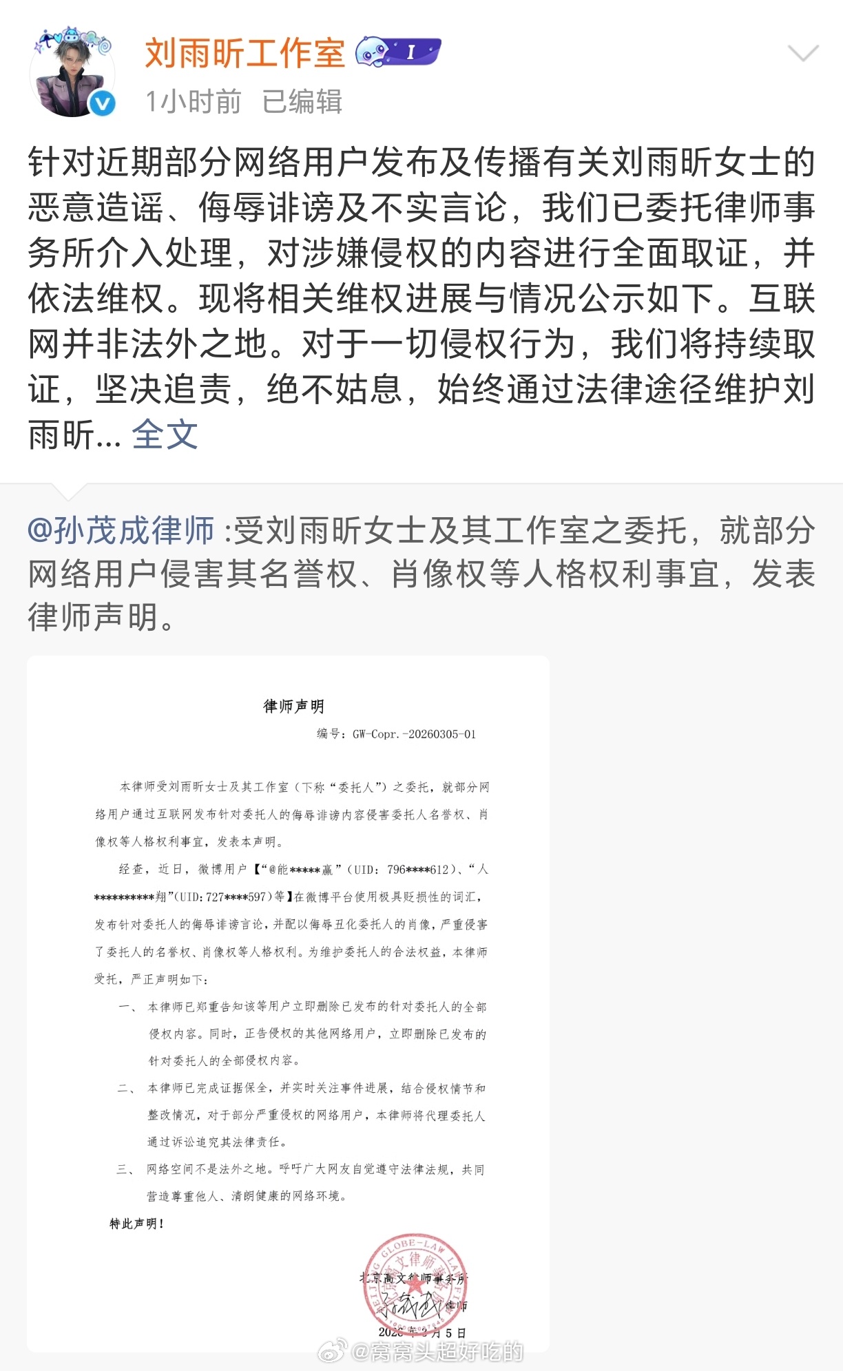 刘雨昕工作室公布告黑名单,针对恶意造谣诽谤的黑粉提起诉讼中,网络非法外之地,支持小刘姐维权!👊👊👊