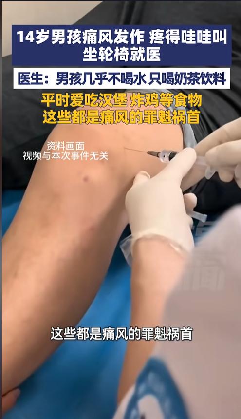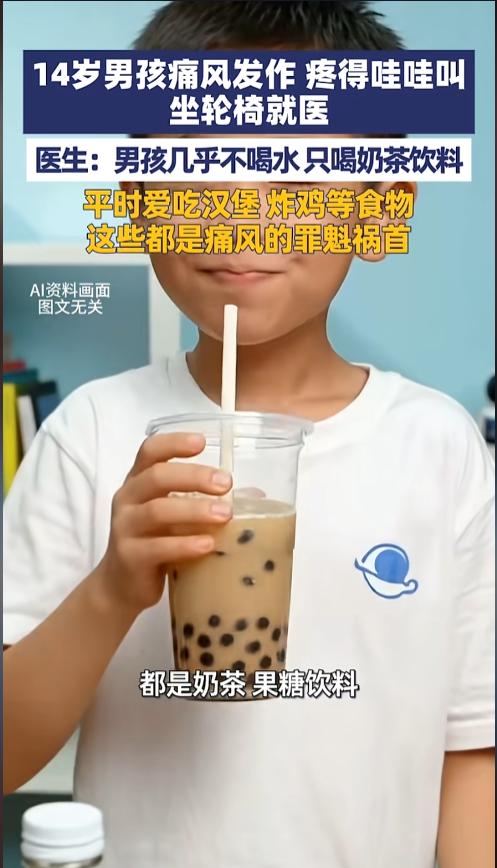 “都是贪吃惹的祸!”近日,河南郑州,一14岁男孩热衷于炸鸡汉堡奶茶,几乎从不喝水。谁知最近身体突然开始疼痛,路都没法走。最后坐在轮椅上,被家人送往了医院。医生一检查,血液中尿酸含量过高,是痛风发作了!网友:这么小就得痛风么? 海鲜啤酒小烧烤,常吃痛风少不了。传统的痛风三件套早已深入人心,但并不是只有这些高嘌呤食物才会引起痛风,痛风也不是中老年人的专属。 据媒体3月5日报道,男孩被送到医院的时候,疼的哇哇叫,只能坐在轮椅上,已经十分严重了。医生询问后发现,男孩平时喝的都是奶茶果茶,几乎从来不喝白水。吃的也都是炸鸡薯条汉堡之类的,高油高糖。这些都是痛风的罪魁祸首。 医生介绍,奶茶果茶虽然不是高嘌呤食物,但其中含有大量的果糖,这些果糖在代谢的时候,会直接促进尿酸的升高,危害性更加严重。 提醒家长千万不要太溺爱孩子,不能他想吃什么就吃什么。痛风是一辈子的病,目前尚无法根治。平时要引导孩子少喝奶茶少吃油炸食品。 网友看后表示,痛风实在是太痛苦了,疼起来根本受不了,不动都疼。自从得了痛风之后,再也不敢喝啤酒,吃海鲜了。这男孩才14岁,就成了病友,太让人惋惜了。家长朋友平时一定要多管管孩子,健康可是一辈子的大事! 信息来源:《3月5日报道,河南郑州,14岁男孩痛风发作疼得哇哇叫,坐轮椅就医,医生:男孩几乎不喝水,只喝奶茶饮料,平时爱吃汉堡、炸鸡等食物,这些都是痛风的罪魁祸首