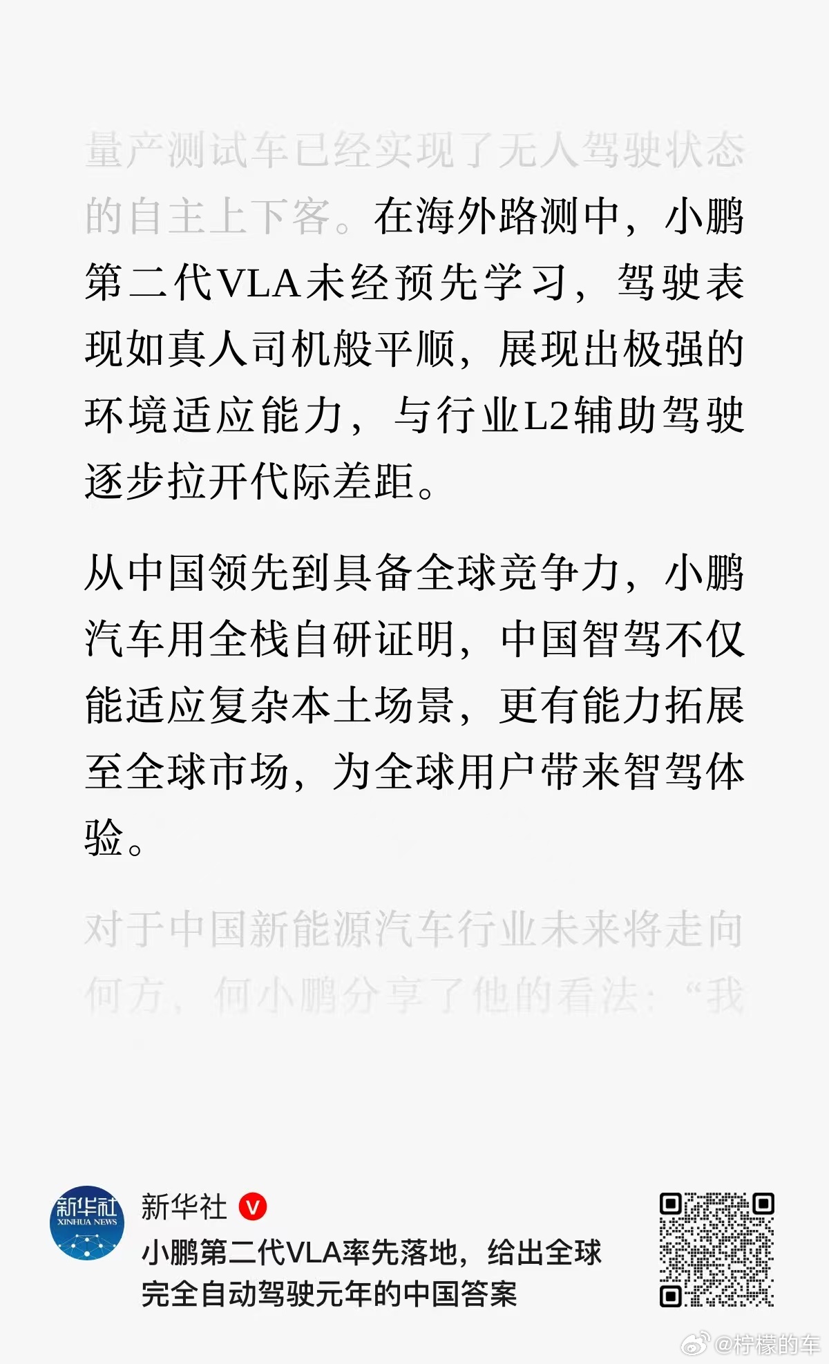 很多人问,小鹏第二代VLA的落地,到底意味着什么?我觉得答案很清晰了,在全球都在探索的完全自动驾驶路程上,中国的身影已经清晰可见了我们总说科技赛道要换道超车,可真正的换道超车,又指代什么呢?我想会是小鹏那样,行业还在辩论L2还是L3的时候,小鹏L4布局都已经定型了。而且更重要的是,从这一刻起,我们的中国品牌,终于有了和特斯拉在全球市场正面掰手腕的实力了,值得点赞新华社点赞小鹏第二代VLA换道超车新华社评小鹏与特斯拉全球直接竞争