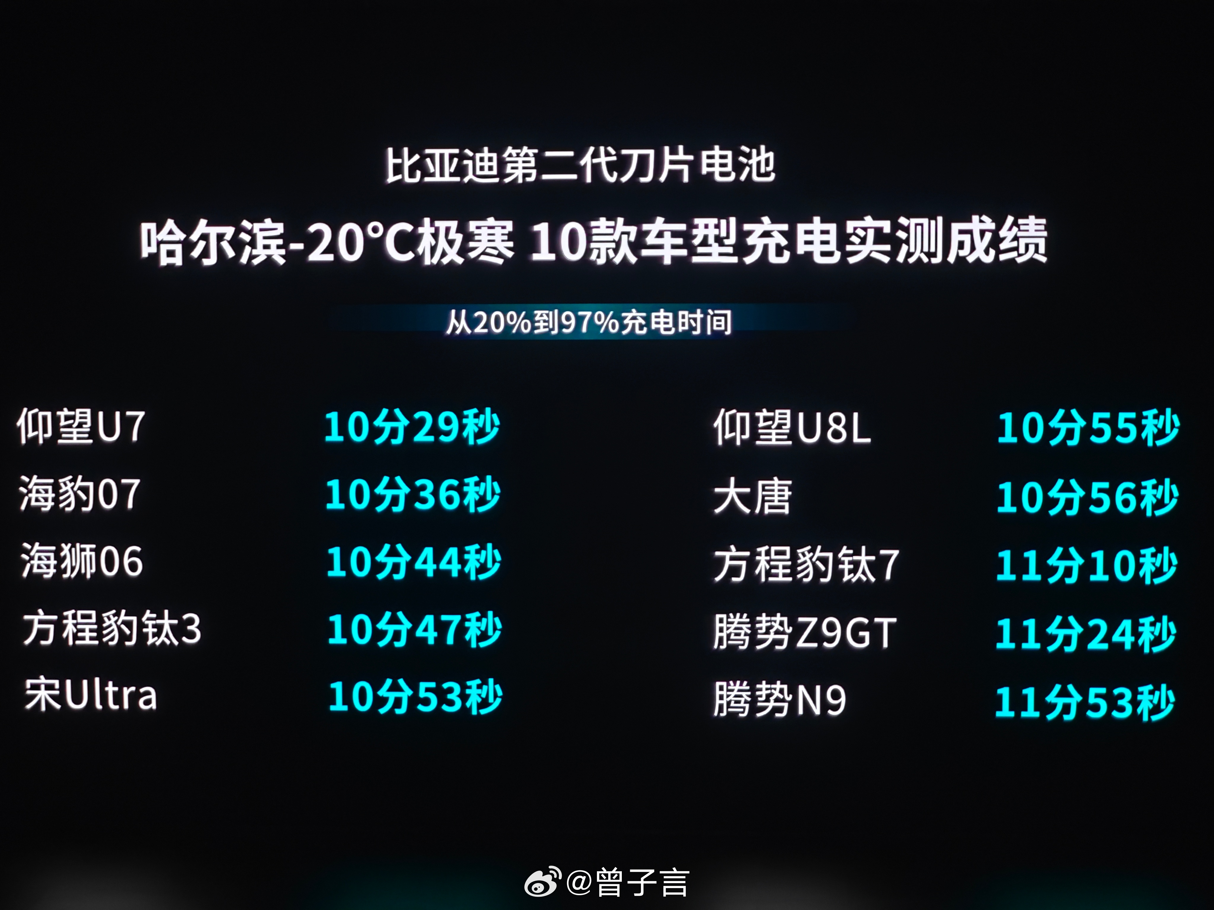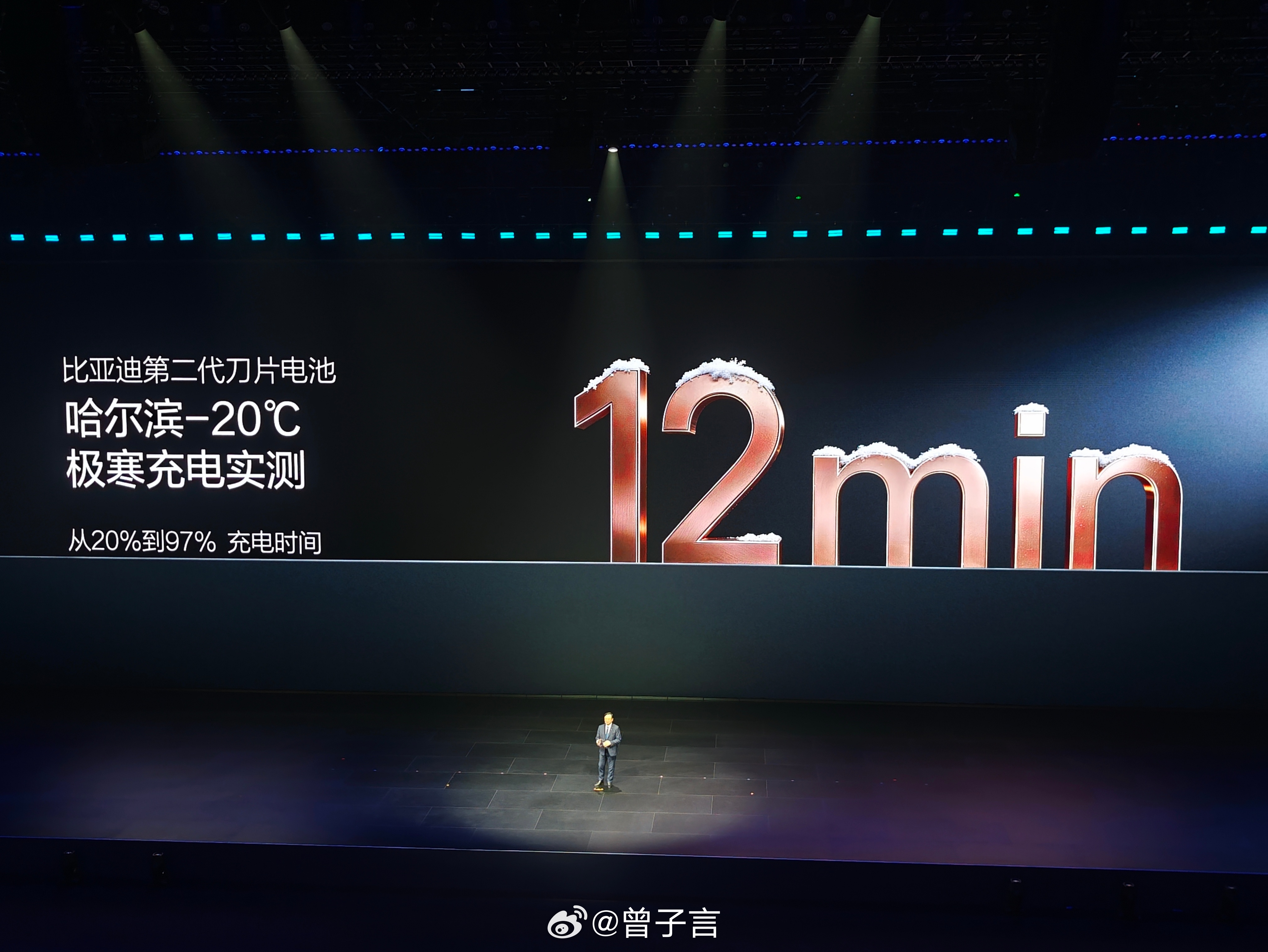 这项依托第二代刀片电池打造的闪充技术,在零下 30℃ 极端低温、电池完整冷冻 24 小时的严苛工况下,实现了 12 分钟内满电的极致表现。