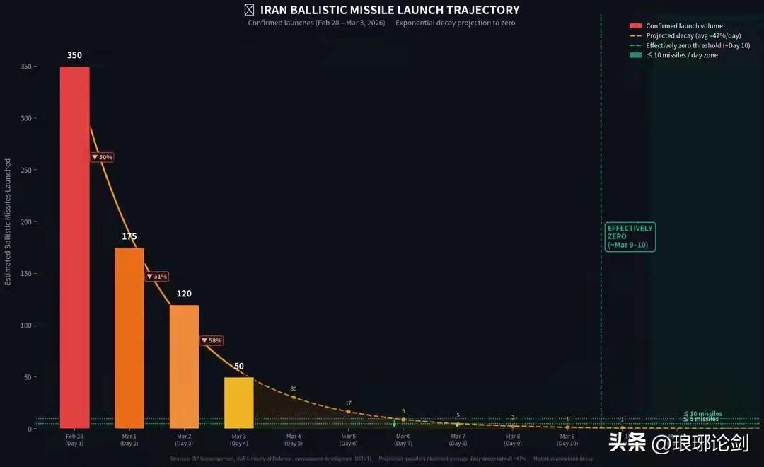 3月5日爆点!伊朗发射率骤降86% 不是瓶颈是大招 看完才懂,伊朗这波降发射率,比狂轰滥炸更狠! 3月5日,美军参谋长联席会议主席丹·凯恩官宣: 伊朗弹道导弹发射率较首日下降86%,24小时内再降23%;无人机打击下降73%。 打了5天,数据断崖式下跌,难道弹道导弹能力遇瓶颈? 真相根本不是弹尽粮绝! • 发射车被打残:美以精准摧毁半数机动发射平台,能打的平台少了,发射效率自然降。 • 战术切换:从“铺量消耗”改“精准点杀”。 用仅剩的30枚法塔赫高超弹(月产仅5枚),专打萨德、指挥中心、机场,15马赫突防,拦截率几乎为零。 配合230架无人机蜂群,打关键节点,不做无效输出。 • 战略算计:前5天狂射500+弹道弹、2000+无人机,先耗光美以拦截弹库存。 现在美以防空弹告急,伊朗再收着打,掐住能源命脉,逼对手付出更大代价。 美军急了:凯恩放话要深入伊朗内陆打击,本质是怕伊朗持续升级战术,让霸权彻底扛不住。 别被表面数据骗了,这不是能力瓶颈,是伊朗的战略降维打击。 霸权靠堆数量,伊朗靠战术与意志,高下立判。 国际战局每一步都藏着算计,真相与深度我都给你扒透。 关注我,第一时间看懂中东战局背后的大国博弈。