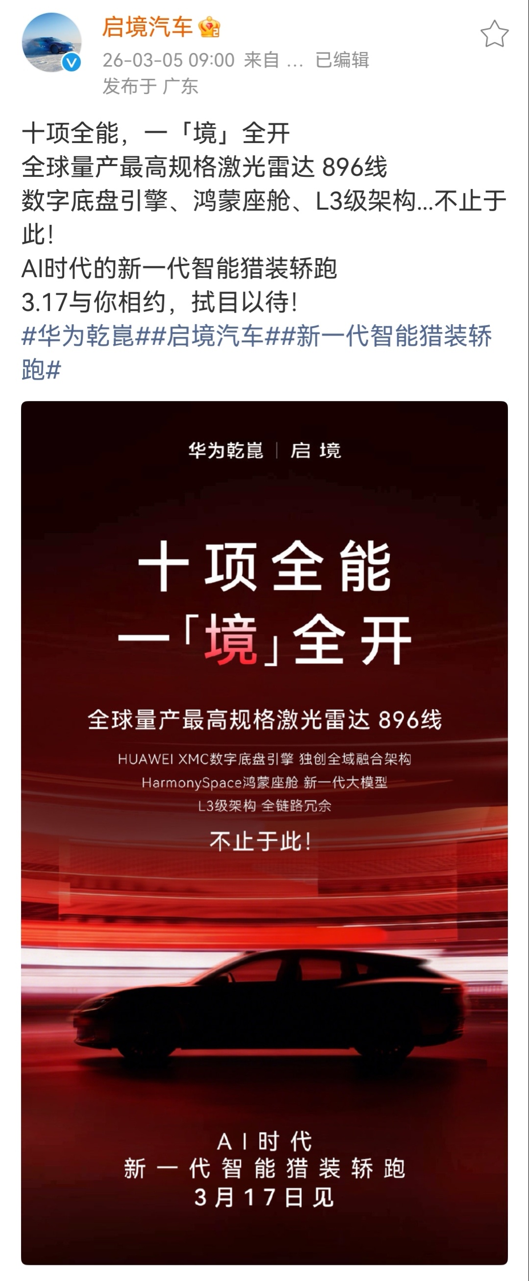 这两天车圈的焦点不仅在鸿蒙智行的新黑科技,启境这边的“一境全开”海报同样干货满满这台新车不仅名字带“7”,在设计上更是将“极致美学”作为核心追求,加大轮毂尺寸、重构底盘底板,共同扛起了百万颜值的大旗。比起颜值,我更关注它的参数,不再是盲猜,官方已确认这台车将全栈搭载“华为新一代智能技术”。这些原本在旗舰上才能看到的配置,比如华为新一代双光路图像级激光雷达、全球量产最高规格896线,以及同级唯一的华为乾崑智驾L3级架构,现在全部在启境上实现技术下放。再加上HUAWEI XMC 乾崑数字底盘引擎,这种极具压制力的百万智能硬件方案,真香预定!华系首款猎装轿跑启境即将亮相启境首款猎装轿跑或命名7系列 深圳