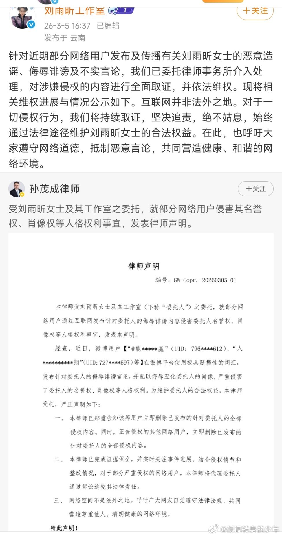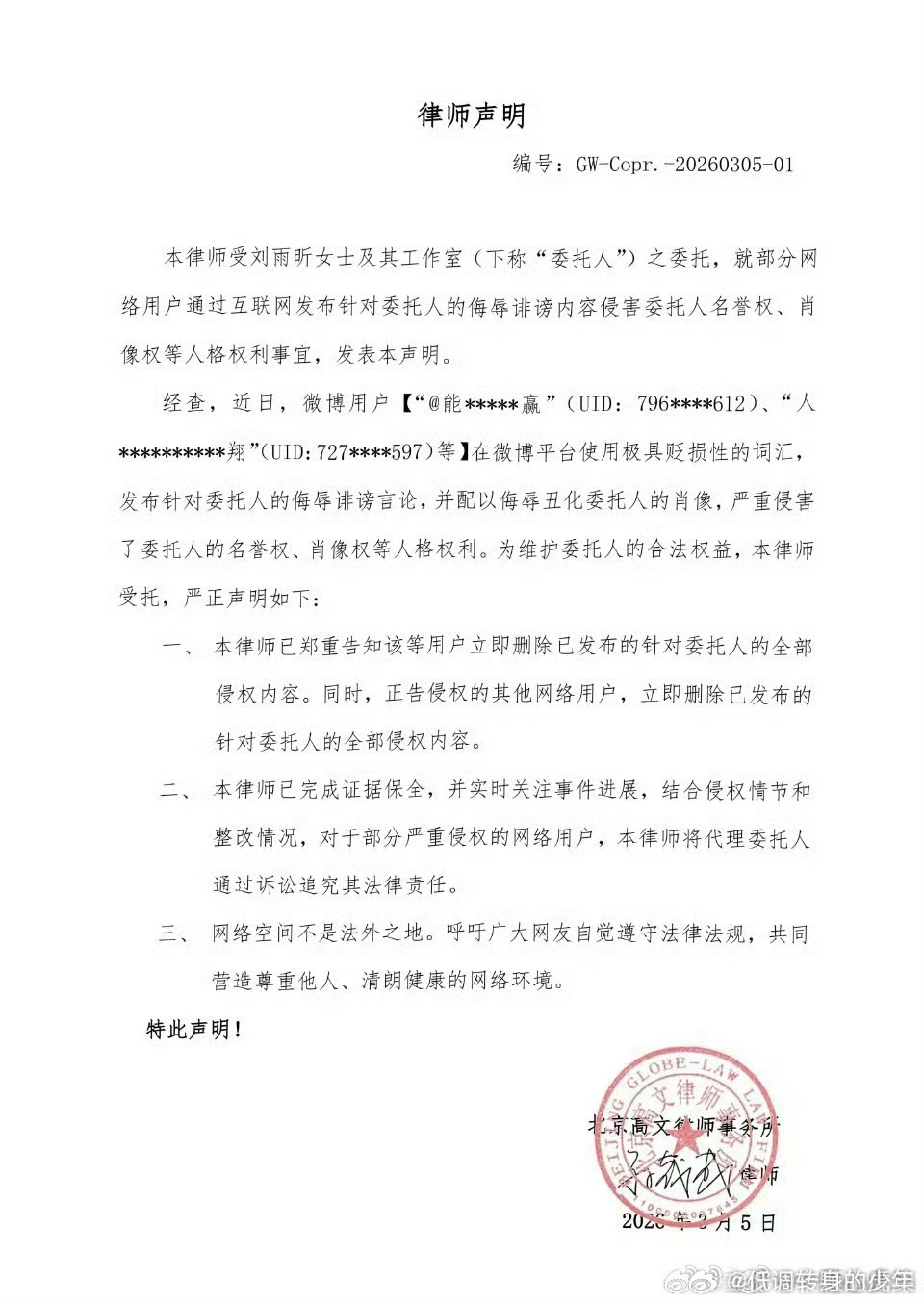 刘雨昕工作室发布告黑进展,已委托律师事务所依法维权!!支持刘雨昕 合理合法维权👏 网络不是法外之地!