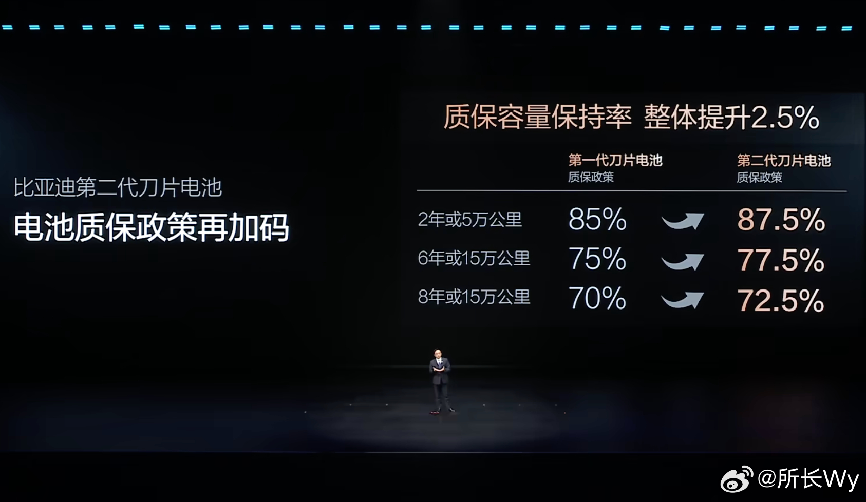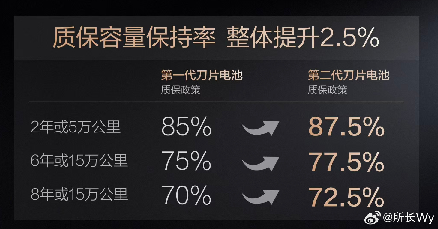 比亚迪二代刀片电池质保加码今天比亚迪总裁王传福在发布会上宣布比亚迪二代刀片电池质保加码:6年或15万公里内,电池包容量保持率低于77.5%即可包换,较此前提升2.5%。这一升级源于第二代刀片电池在安全性能上的飞跃。新国标要求300次快充循环后短路不起火,而比亚迪实现500次闪充循环后,边闪充边针刺依旧安全,无热失控、无冒烟起火。比亚迪以技术实力为用户筑起安全屏障,彰显中国动力电池技术的全球引领地位,为新能源汽车高质量发展树立标杆。比亚迪第二代刀片电池来了