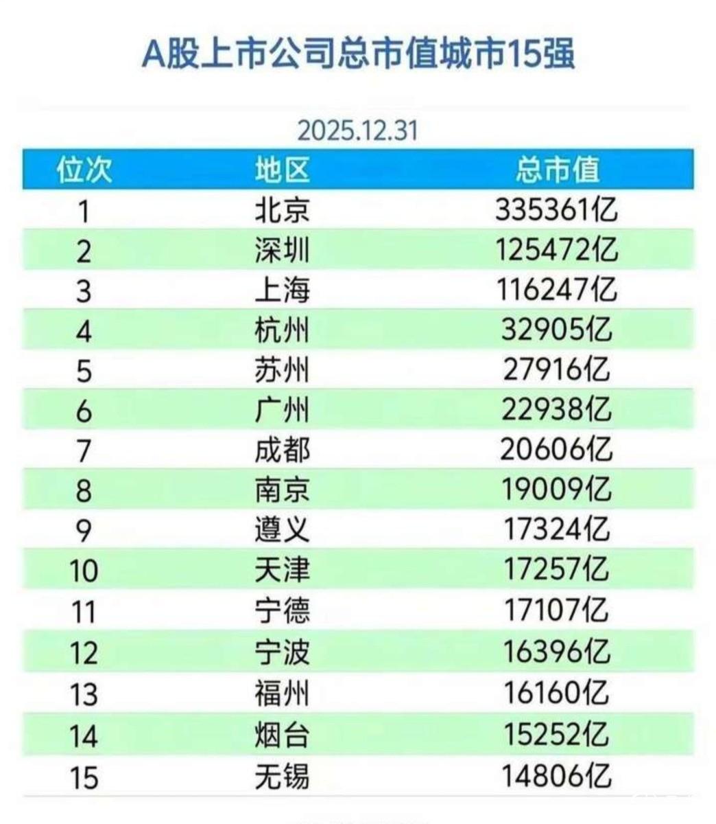 重庆上市公司的总市值,全国前15名都排不进去? 看到一份2025年全国A股上市公司总市值的城市排名,北京,上海,深圳排名前三,成都排名第七位。 让人意外的是,直辖市重庆在这份榜单中,连15名都没有挤进去,比烟台和无锡等地级市还要低一些。 而且我还留意到,整个中西部,就成都上榜了,武汉西安这些中心城市也没有进入15强,有点奇怪,难道是统计有误差?